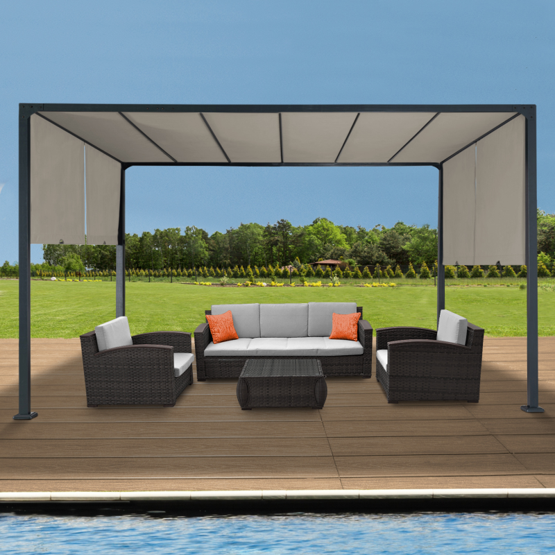 Apportez une touche de modernité dans votre jardin ou sur votre terrasse grâce à cette pergola et ses deux toiles coulissantes taupe au design épuré. Avec ses généreuses dimensions de L.4 x l.3 x H.2,20 m ainsi que ses deux pans, vous pourrez créer votre propre espace d'ombrage personnalisable. Il vous suffit de tirer la toile d'un côté ou de l'autre de la structure pour ombrager la partie du jardin que vous souhaitez. Pour un espace plus cocooning et douillet, vous pourrez tout à fait tirer complètement vos toiles d'un côté et ainsi vous reposer tout en profitant de votre jardin.Cette pergola coulissante, au design à la fois chic, moderne et épuré, s'accordera parfaitement avec votre mobilier extérieur. En effet, la structure grise de la pergola, avec sa finition en peinture époxy et sa toile taupe, vous offre la possibilité d'associer votre pergola à l'ensemble de votre mobilier de jardin sans faute de goût ! La structure de la pergola se fixe au sol grâce à ses 4 pieds de 5x5 cm. Chaque pied est relié par des traverses de 25x50 mm, de quoi stabiliser votre pergola et lui offrir une bonne résistance aux intempéries. Optez pour cette pergola aux deux toiles coulissantes coloris taupe et protégez-vous du soleil comme de très faibles pluies ! Vous venez de trouver la pièce manquante à votre terrasse, il ne vous reste plus qu'à en profiter.Dimensions de la pergola 3x4 M toile taupeDimensions totales hors tout : Longueur 400 cm x largeur 300 cm x Hauteur 220 cmStructure en acier finition poudre de peinture griseToile en polyester 160 gr/m² taupeDimensions des pieds : 5 x 5 x 220 cmDistance entre les pieds : 285 x 385 cmDimensions des traverses : 25 x 50 mmDimensions des tubes : D.19 mmÀ monter soi-même Pensez à bien fixer la pergola au sol pour assurer une bonne stabilité.Ce modèle de pergola 2 pans est disponible en gris anthracite et écru. Retrouvez également l'ensemble de nos pergolas sur notre boutique en ligne !
