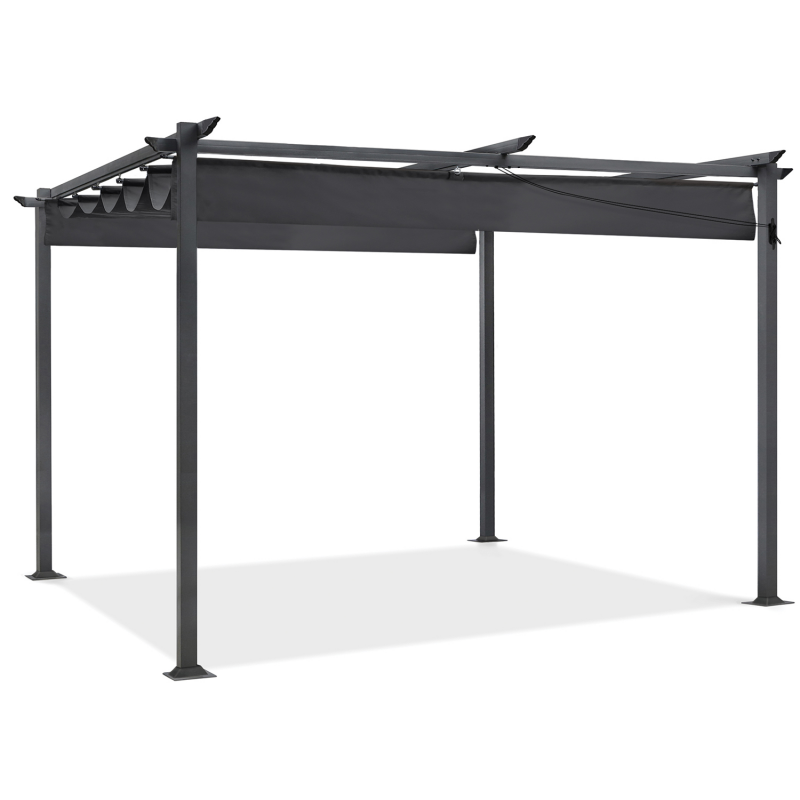 Cette superbe tonnelle de jardin donnera du cachet à votre terrasse et vous protégera du soleil et des intempéries grâce àson toit rétractable très pratique.Élégante et contemporaine, cette pergola 3,96 x 2,96 M qui se fixe au sol vous offrira un espace frais et ombragé sur votre terrasse tout l'été !Son toit rétractable monté sur rails avec toile grise 100% polyester 180 gr/m² revêtement en polyamide lui apporte élégance et modernité.Au choix, vous restez à l'ombre sous la toile ou au contraire vous bronzez en la coulissant selon l'orientation du soleil.Sa structure robuste en métal laquée grise anthracite lui assure une parfaite stabilité et longévité.Dimensions pergola toit rétractable gris- Dimensions totales hors tout : Longueur 396 CM x largeur 296 CM x Hauteur 230 CM- Dimensions d'un pied : 6 x 6 CM- Largeur des barres transversales : 3 x 4 CMModèle disponible dans d'autres coloris sur notre boutique en ligne :- Pergola toit rétractable taupe 3x4 M- Pergola toit rétractable gris 3x4 MRetrouvez également l'ensemble de nos pergolas ! Nous vous préconisons en cas d'intempéries comme le vent ou la pluie de retirer la toile de sa structure et ainsi prévenir du risque de stagnation d'eau ainsi que de bien fixer la pergola au sol..