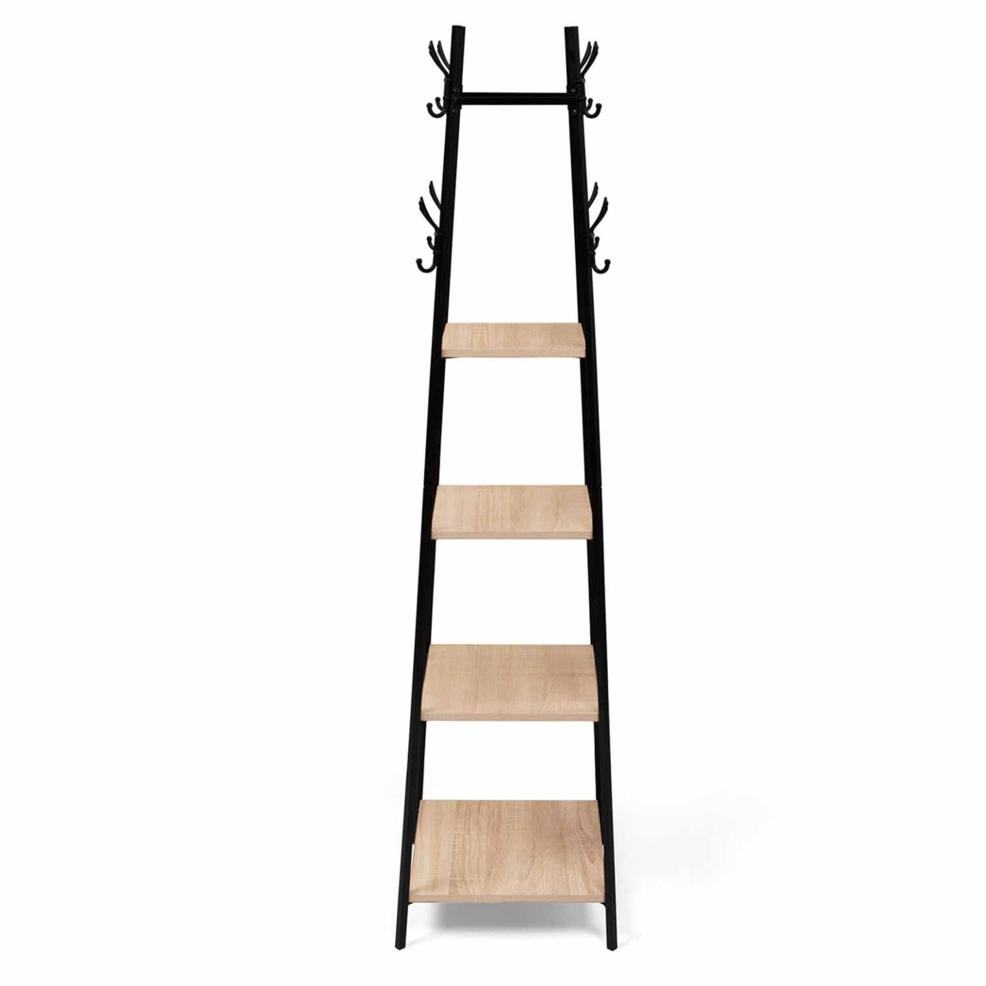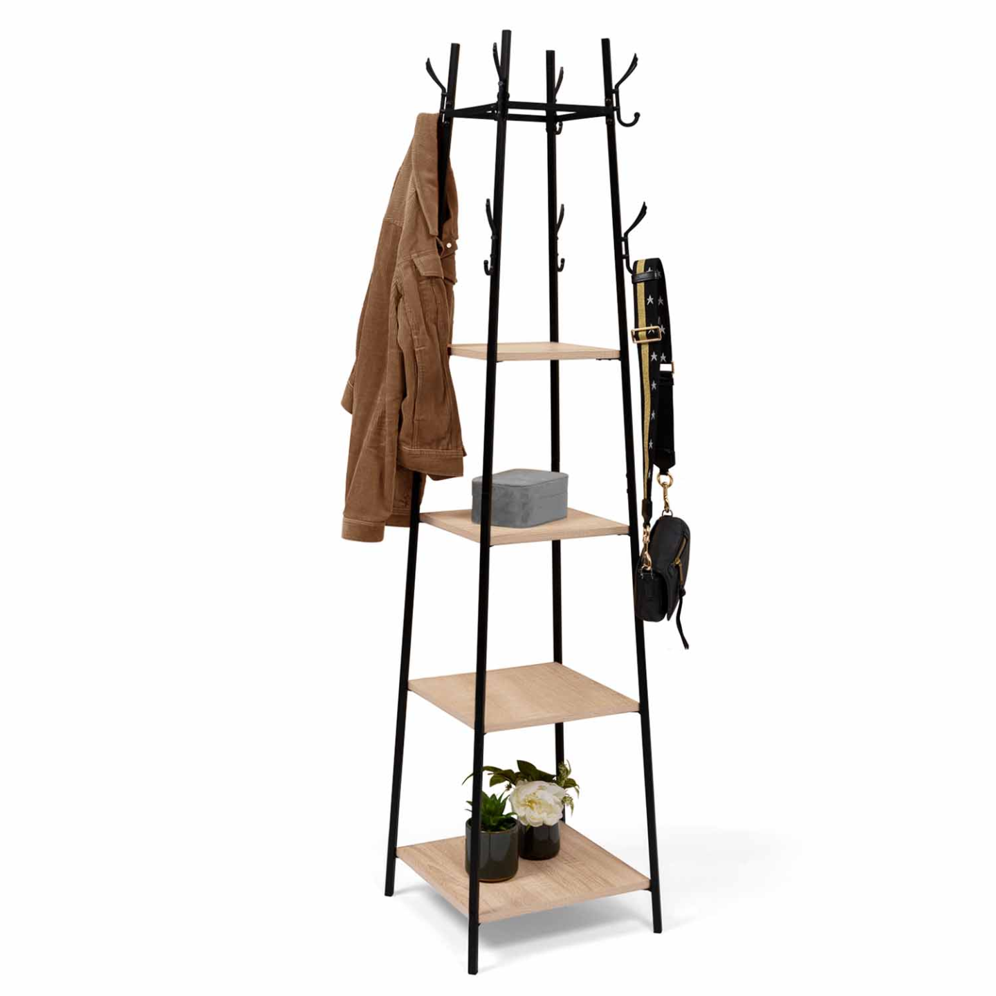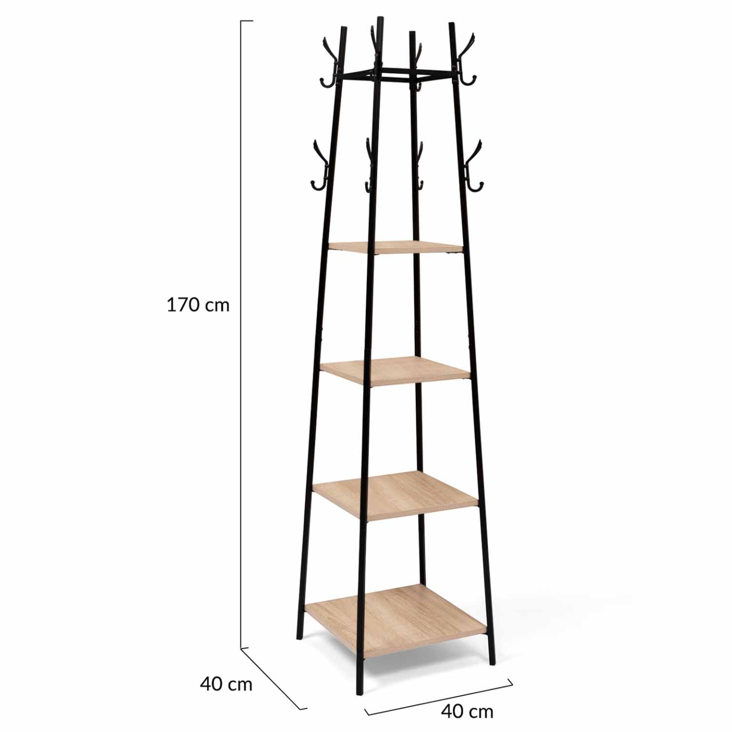 À la fois design et esthétique, ce joli porte-manteau PIERO design industriel s'accordera facilement à votre intérieur ! Vous pourrez l'installer dans une entrée, un couloir, une chambre, une buanderie ou tout autre pièce de votre maison pour maximiser le rangement et ainsi éviter le désordre.Muni de 8 patères double crochet en plastique noir, vous organiserez simplement le rangement de vos manteaux, vestes et accessoires sans encombrer votre vestibule.Ses 4 étagères effet bois naturel apporteront une touche chaleureuse au porte-manteau tout en favorisant le rangement.Grâce à ses quatre plateaux, vous pourrez y poser un vide-poche, une petite plante ou tout autre objet de décoration.Son quadruple piètement apportera stabilité et robustesse à l'ensemble du porte-manteau PIERO.Le mélange du coloris bois naturel et de sa structure en métal noir donneront du charme et de l'élégance à ce porte-manteau !N'attendez plus et embellissez votre pièce en créant un espace chaleureux et ordonné grâce à ce porte-manteau PIERO design industriel !Dimensions du porte-manteau PIERO bois et noirDimensions globales : Longueur 40 cm x largeur 40 cm x Hauteur 170 cmDimensions planche 1 : L. 27,5 cm x l. 27,5 cmDimensions planche 2 : L. 30,5 cm x l. 30,5 cmDimensions planche 3 : L. 33,7 cm x l. 33,7 cmDimensions planche 4 : L. 37 cm x l. 37 cmÉpaisseur étagères : 1,2 cmMatériaux : Métal (1,5 cm x 1,5 cm) et MDF 1,2 cmColoris : Noir et boisComporte 8 patères et 4 étagèresÀ monter soi-mêmeRetrouvez l'ensemble de nos porte-manteaux et vestiaires d'entrée sur notre boutique en ligne !