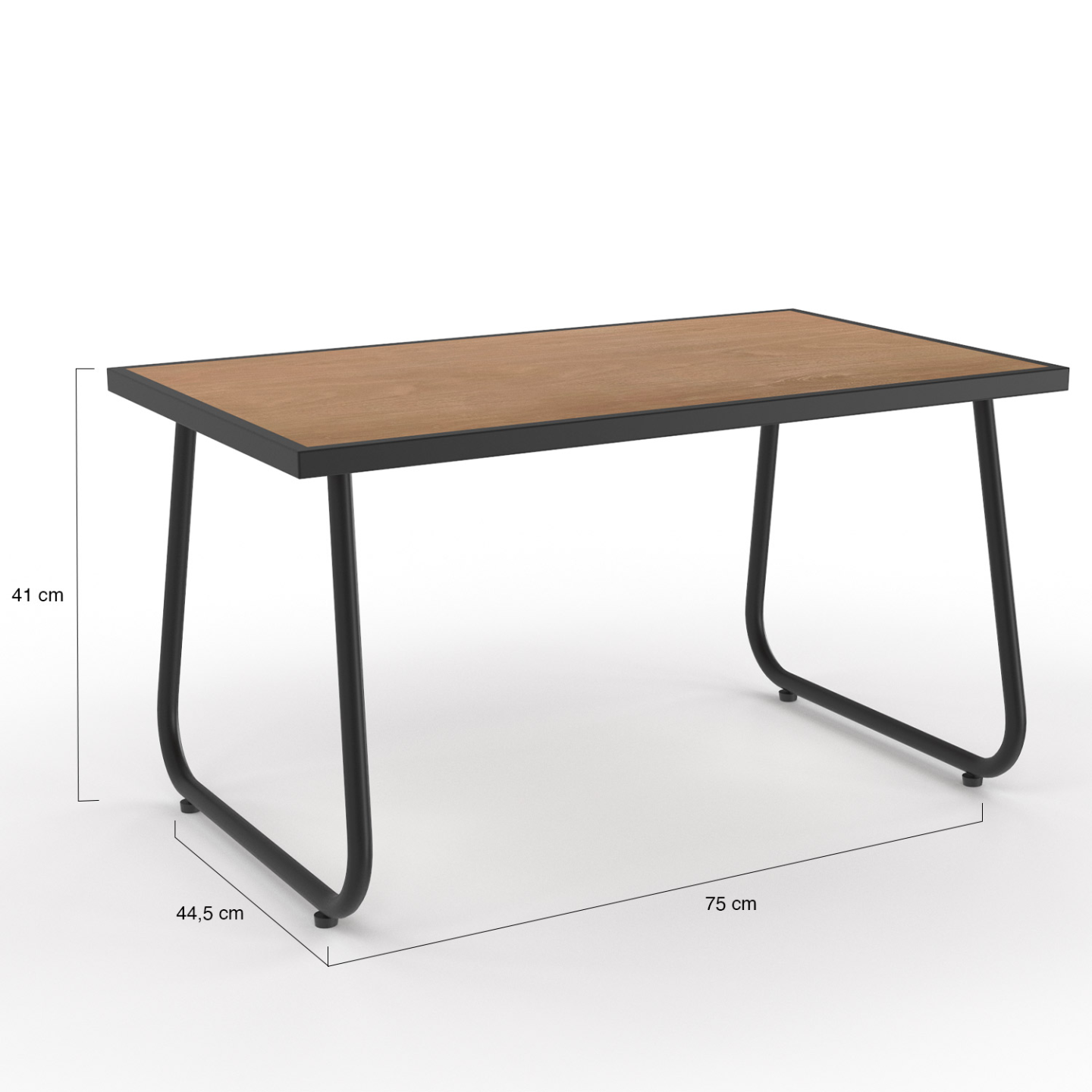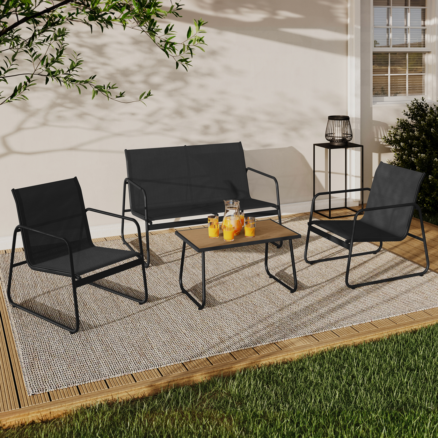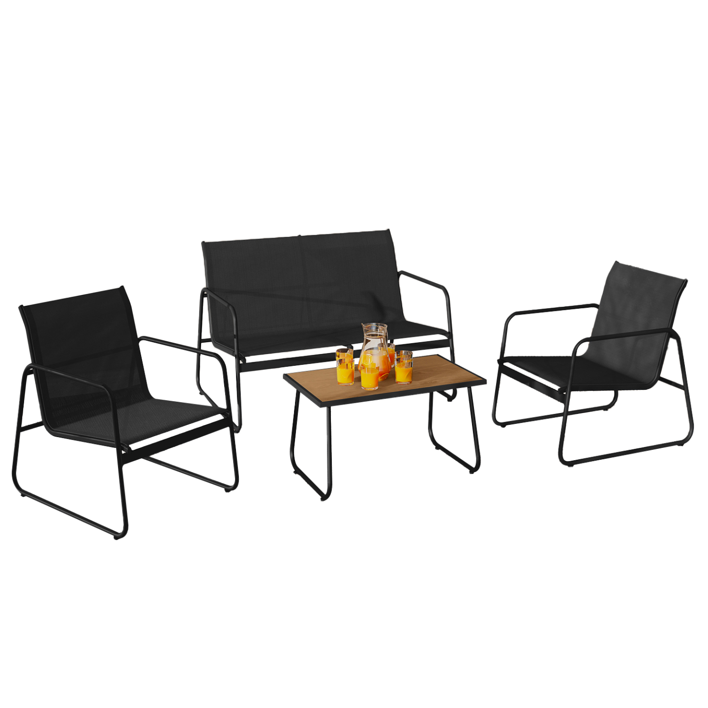 Vous souhaitez embellir votre jardin ou terrasse, en ajoutant du mobilier moderne et tendance? Le salon de jardin en acier et textilène est fait pour vous !Profitez-en pour lézarder au soleil, y passer des moments conviviaux en famille ou entre amis, ou bien simplement partager un bon repas. Vous venez de trouver le compagnon idéal pour la période estivale ! Composé d'un canapé, de deux fauteuils et d'une table basse avec plateau effet bois, ce salon d'extérieur prévu pour 4 personnes a tous les atouts pour vous faire profiter au maximum des beaux jours. Son design sobre avec sa structure et son assise en textilène noir, apportera à votre espace extérieur une véritable touche d'élégance. De plus, l'assise en textilène du canapé et des fauteuils vous promet un grand confort, et vous adorerez y passer du temps jours après jours. Sa structure en acier, associée aux assises en textilène offre à ce salon une importante résistance aux intempéries. Egalement, la table basse avec son plateau effet bois, vous promet une grande robustesse et un nettoyage facile et rapide. Tous ces matériaux sont parfaits pour vous, car en plus de leur grande résistance, l'entretien du salon de jardin est d'une grande facilité.Coussins non fournis.Dimensions du salon de jardin bas MALAGA 4 places textilène noir et plateau effet bois- Dimensions de la table : Longueur 75 CM x largeur 44,5 CM x Hauteur 41 CM- Dimensions d'un fauteuil : Longueur 56.5 CM x largeur 74 CM x Hauteur 76 CM- Dimension du canapé : Longueur 110.5 CM x largeur 74 CM x Hauteur 76 CM- Structure en acier – Assise en textilène- Plateau de table revêtement effet boisDécouvrez aussi nos autres références de salon bas de jardin sur notre boutique en ligne !