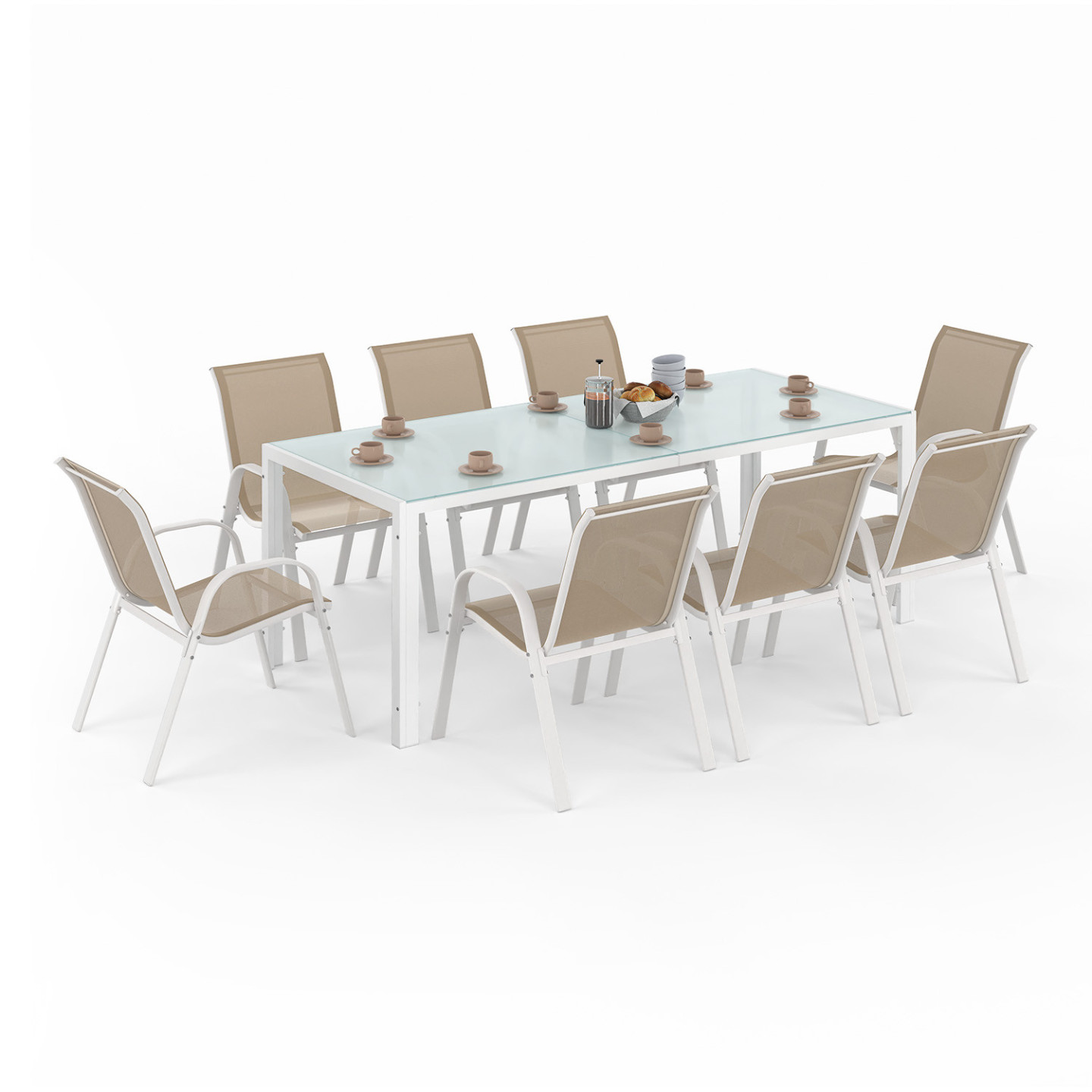 Prenez vos repas en plein air et invitez votre famille et vos amis à se réunir autour de ce salon de jardin MADRID ! Avec sa capacité d'accueil de 8 personnes, profitez de moments chaleureux à plusieurs et échangez en toute convivialité ! Grâce à ses 8 chaises empilables, cet ensemble de jardin propose ergonomie et facilité d'installation. Sa structure en acier, pensée pour les repas en extérieur, lui confère robustesse et longévité.Le coloris blanc associé au coloris beige des assises confère à ce salon un look tendance et moderne qui s'intègrera parfaitement à votre extérieur !Composé d'un plateau de table en verre trempé transparent, le salon MADRID apporte modernité et design dans votre jardin ou sur votre terrasse. La structure en acier ainsi que le dossier et l'assise des chaises en textilène facilitent l'entretien de cet ensemble table et chaises de jardin.De plus, si vous souhaitez protéger votre salon de jardin, installez une housse pour chaises de jardin ainsi qu'une housse pour table de jardin.Profitez des beaux jours grâce au salon de jardin MADRID et usez de son ergonomie pour partager en famille ou entre amis des moments de bien-être ! Dimensions du salon de jardin 8 places Ensemble composé d'une table et de 8 chaises empilablesDimensions de la table : Longueur 190 cm x largeur 80 cm x Hauteur 73 cmStructure de la table et des chaises : acier Plateau de table en verre trempé : 5 mmDimensions d'une chaise : L. 51,5 x l. 68 x H. 84 cmMatière du dossier et de l'assise : textilèneColoris : acier blanc et textilène beige À monter soi-mêmeDécouvrez également tous nos salons de jardin sur notre boutique en ligne !