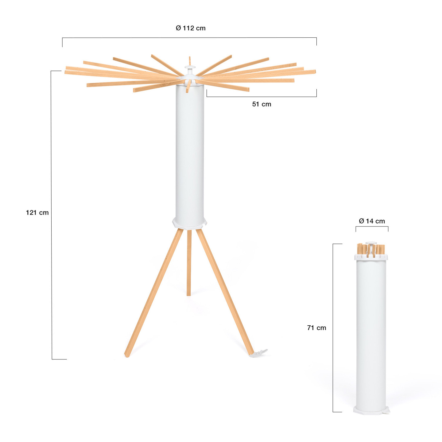 Doté de 16 tiges spacieuses, il vous permet de suspendre chemises, pantalons, serviettes et autres vêtements en toute simplicité. Chaque tige dispose de 3 encoches, idéales pour optimiser la répartition du linge.Son système ajustable vous offre une grande flexibilité : les tiges peuvent être déployées à 90°, 180°, 270° ou même 360°, pour s'adapter à vos besoins et à l'agencement de votre pièce.Conçu pour supporter jusqu'à 20 kg de linge, ce séchoir est suffisamment solide pour accueillir aussi bien des vêtements légers que des pièces plus lourdes.Sa structure à trois pieds assure une excellente stabilité, même lorsqu'il est chargé au maximum. Vous pouvez l'utiliser en toute confiance, sans craindre les déséquilibres.Pratique, il se plie facilement après usage : une fois fermé, ses dimensions réduites permettent de le glisser dans un placard ou derrière une porte.Son design bois et métal ajoute une touche chaleureuse et moderne, qui s'intègre harmonieusement dans tout type d'intérieur, même lorsque le séchoir est ouvert.Léger, stable et peu encombrant, il devient l'allié indispensable des familles comme des petits espaces.Dimensions du séchoir à linge à rayon rotatif Dimensions globales : Longueur 112 cm x largeur 112 cm x Hauteur 121 cmDimensions fermé : L. 71 x l. 14 x H. 14 cmLongueur des tiges : 51 cmNombre de tiges : 16Nombre d'encoches par tige : 3Nombre de pieds : 3Capacité : 20 kgMatériaux : Bois et plastiqueRetrouvez l'ensemble de nos meubles de salle de bain sur notre boutique en ligne !