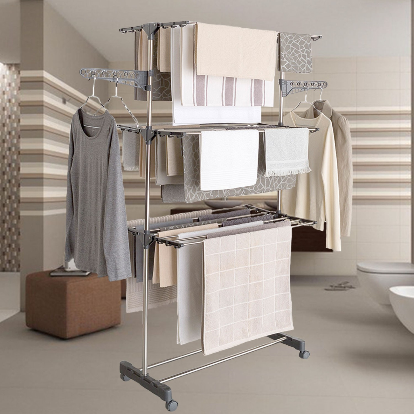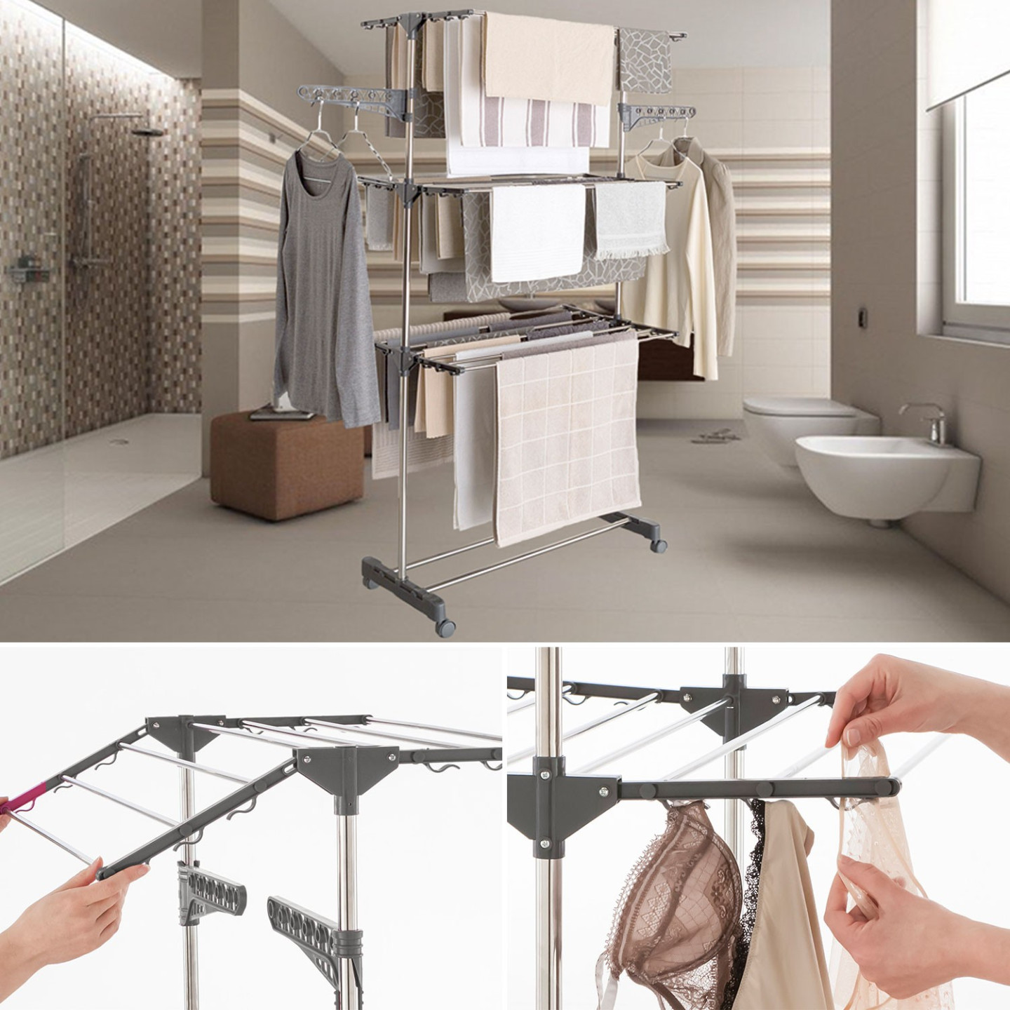 Une fois l'étendage à linge monté, on sent sa fragilité et il a fallu renforcer la fixation des barres qui sortaient de leur encoche quand on déplaçait l'étendage sur ses roulettes. Sinon de bonnes possibilités d'étendre : sur les barres transversales, sur les 2 bras porte-ceintres ou sur leurs crochets.