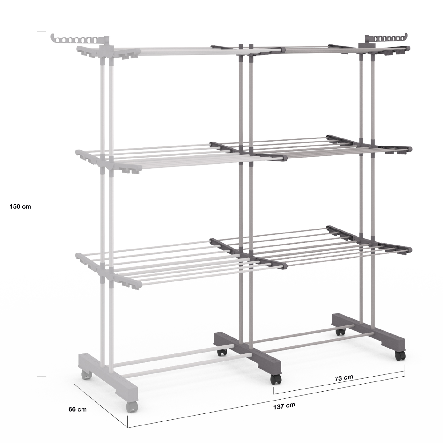 Le grand séchoir à linge MAXI et ses 40 mètres d'étendage est le support idéal pour faire sécher plusieurs lessives et étendre le linge de toute la famille en même temps.Véritable révolution dans l'univers des séchoirs à linge, il est doté de multiples fonctionnalités pour vous simplifier la corvée des lessives !Servez-vous des clips à chaussettes et à sous-vêtements intégrés, et faites sécher vos robes et chemises directement sur cintres grâce aux porte-cintres situés à chaque extrémité de cet étendoir. Malin, sa fonction extensible vous permettra de doubler la surface d'étendage facilement. Pratique, il est doté de 3 niveaux pour pendre vos vêtements, ainsi vous pouvez décider de les rabattre afin de pendre du linge plus long comme des serviettes ou des draps. Solide et astucieux, ce grand étendoir à linge se déplace facilement de la buanderie à la salle de bain et tourne sur lui-même grâce à ses roulettes. Une fois plié, l'étendoir MAXI se fait tout petit pour ne pas vous encombrer.Fini le casse-tête des lessives, ce séchoir à linge MAXI 40 mètres complet vous facilitera la tâche au quotidien. Dimensions de l'étendoir à linge extensible 40 M MAXI Dimensions déplié : Longueur 73-137cm x largeur 66cm x Hauteur 150 cmDimensions replié : Longueur 73 cm x largeur 66cm x Hauteur 150 cmMatériaux : Acier peint et plastiqueColoris : GrisÀ monter soi-mêmeRetrouvez tous nos modèles de séchoir à linge et nos accessoires de buanderie sur notre boutique en ligne !