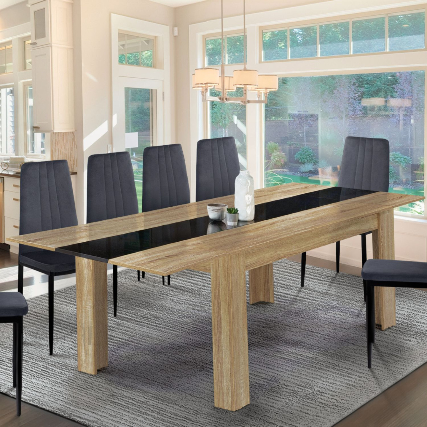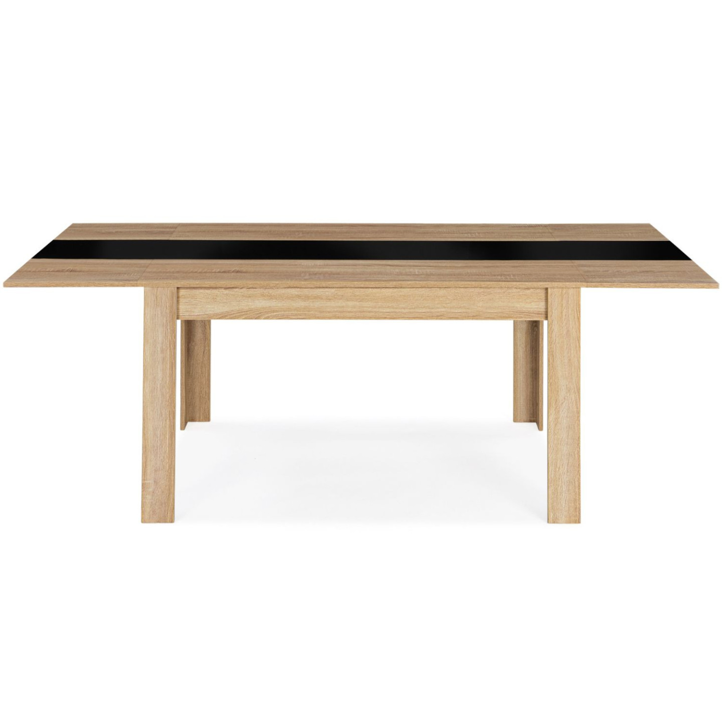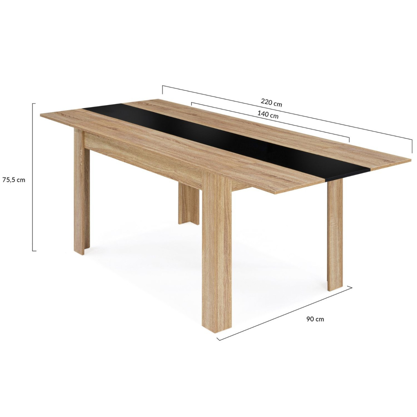 Vous avez une famille nombreuse et aimez recevoir vos proches ? Préparez de bons repas et partagez-les sur une table de salle à manger chic contemporaine. Avec son design bicolore coloris bois imitation hêtre et noire, et ses lignes épurées, la table extensible GEORGIA offrira un style contemporain à votre intérieur. Vous apprécierez le détail de sa bande centrale coloris noir finition laquée !Repas de famille, soirées entre amis... la table à manger extensible 6-10 personnes s'adapte à vos événements pour un moment convivial ! Grâce à ses 2 rallonges latérales de 40 cm chacune, passez en un rien de temps à un plateau de 220 cm de long pour accueillir toute la famille.Ingénieuse, grâce à ses extensions qui se rangent discrètement sous le plateau, vous gardez les rallonges à portée de main ! Installez rapidement 1 ou 2 extensions selon le nombre de convives. Une véritable solution gain de place ! La table en panneaux de particules de bois 1,5 cm est surélevée de 4 pieds en bois 10 x 10 cm, ce qui lui confère stabilité et robustesse.Laissez-vous séduire par la table GEORGIA extensible 6-10 personnes et profitez de dîners conviviaux en famille ou entre amis !Dimensions de la table de salle à manger extensible 140-220 cmDimensions globales : Longueur 140 cm x largeur 90 cm x Hauteur 75,5 cmDimensions globales avec rallonges : L. 220 x l. 90 x H. 75,5 cmDimensions pieds : 10 x 10 cmEspace entre les pieds sur la largeur : 116 cmMatériaux : panneaux de particules de bois PB2 rallonges de 40 cm chacune inclusesCapacité : 6 à 10 personnesÀ monter soi-mêmeCe modèle est également disponible en version blanc et gris et noir plateau hêtreDécouvrez l'ensemble de nos tables à manger extensibles sur notre boutiques en ligne !