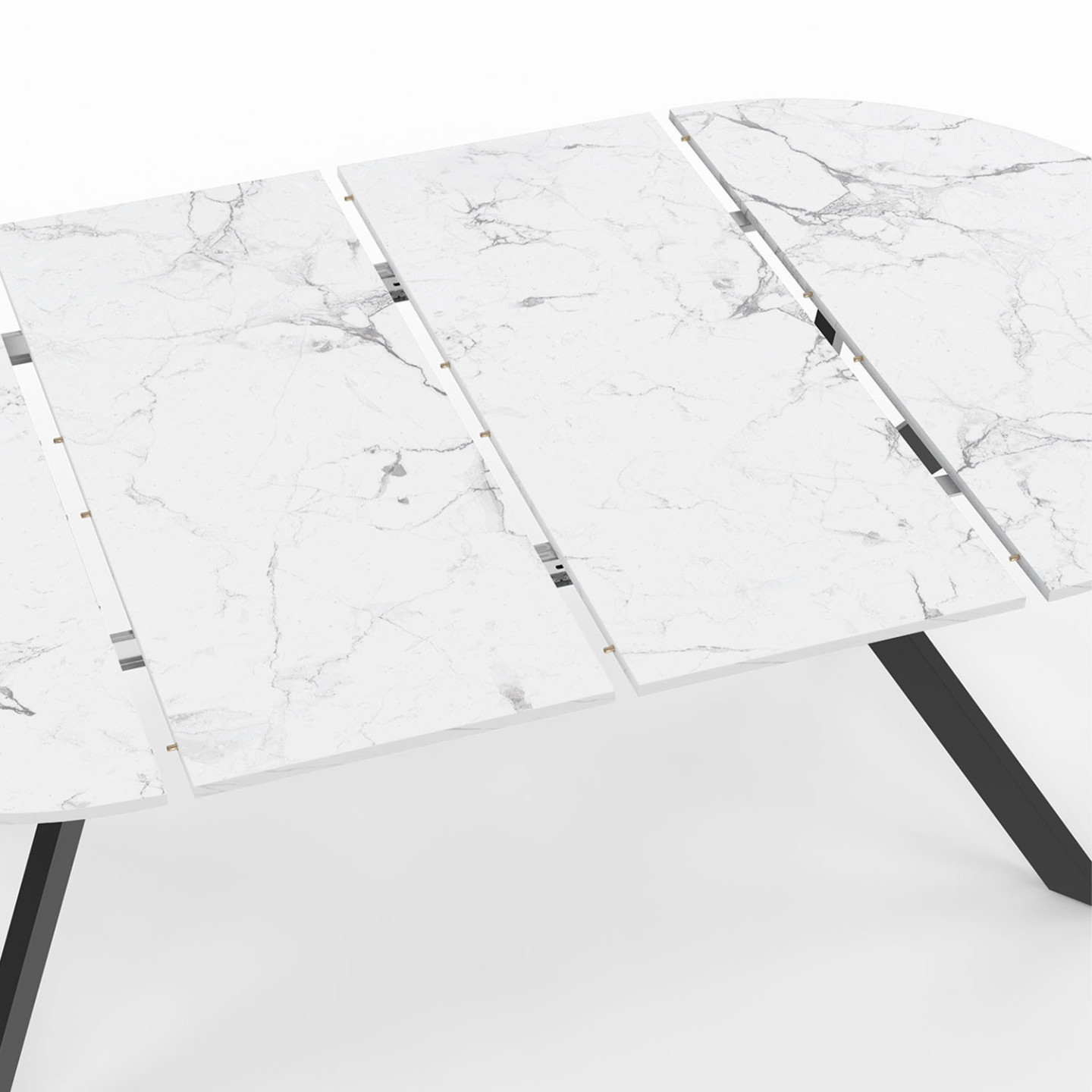 Le design moderne s'invite dans votre salle à manger avec cette table extensible ronde ALIX 110-200 cm, bi-matière plateau effet marbre d'une capacité de 4 à 10 personnes !Son pied araignée en métal noir lui apporte une touche d'originalité et de modernité. Tandis que son plateau de diamètre 110 cm apporte un côté sophistiqué à votre intérieur. Profitez de votre repas en toute tranquillité, autour d'un apéro en famille, entre amis ou bien installez-vous avec votre ordinateur pour consulter vos mails !La table effet marbre est dotée de deux extensions de 45 cm pour passer en un rien de temps à un plateau de 155 ou 200 cm de long afin d'accueillir toute votre famille lors d'un repas.Passez de 4 à 6 – 10 personnes en ajoutant la première extension de 45 cm et obtenez un plateau de 155 cm de long. Pour vous permettre de partager de bons moments en famille ou entre amis, ajoutez la seconde rallonge qui offre une capacité d'accueil de 10 convives !Sa forme ronde, conviviale, en fait une table à manger idéale pour partager des moments privilégiés avec vos proches tout en facilitant la circulation au sein de la pièce.De plus, sa structure en PB et son pied en métal noir lui assurent stabilité et robustesse !Optez pour le style design moderne et craquez pour la table extensible ronde ALIX 110 - 200 cm !Dimensions de la table extensible ronde ALIX bois et métal 110 - 200 cmDimensions globales : Longueur 110/200 cm x largeur 110 cm x Hauteur 75 cm2 rallonges de 45 x 110 cm intégrées Longueurs possibles : 110 - 155 - 200 cm Matériaux : panneaux de particules de bois (PB) et métalColoris : effet marbre blanc et noirCapacité : 4 à 10 personnesÀ monter soi-mêmeRetrouvez l'ensemble de nos tables à manger sur notre boutique en ligne !