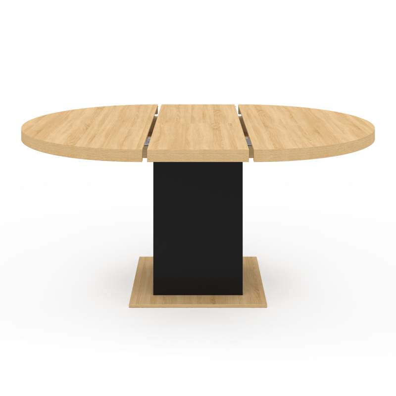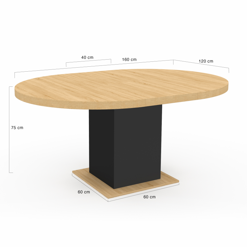 Vous avez une famille nombreuse ? Vous aimez recevoir vos proches ? Préparez de bons repas et partagez-les sur une table de salle à manger contemporaine. Avec son pied central noir et son plateau en bois clair, la table EDEN bois et noir s'intégrera parfaitement à votre intérieur en lui apportant un esprit moderne et design !Repas de famille, soirée conviviale entre amis... la table à manger extensible 6-8 personnes s'adapte à vos événements pour un moment convivial ! Grâce à son extension de 40 cm, passez en un rien de temps à un plateau de 160 cm de long pour accueillir toute la famille. Vous n'êtes que 6 ce soir ? L'extension se range discrètement sous le plateau, pour rester toujours à portée de main.Avec son pied central et son grand plateau épais, la table en bois EDEN est d'une grande stabilité et très robuste. Avec ses dimensions généreuses, cette table industrielle ronde 120/160 cm x 120 cm vous permet d'accueillir de nombreux convives pour de merveilleux moments de partage.Cette table à l'aspect massif aux lignes épurées sera la pièce maîtresse de votre salle à manger. Son style lui donne un aspect tendance qui s'adapte parfaitement aux univers classiques et contemporains. La combinaison des coloris effet hêtre et noir et d'un matériau chaleureux est une association parfaite pour apporter un look chic et sobre à votre salle à manger.Dimensions de la table de salle à manger extensible EDEN bois et noirDimensions globales : Longueur 120 cm x largeur 120 cm x Hauteur 75 cmDimensions globales avec l'extension : L. 160 x l. 120 x H. 75 cmMatériaux : panneaux de particules mélaminés (1,5 cm)Dimensions rallonge : L.40 x l.120 cmÉpaisseur totale du plateau : 5 cmDimensions du pied central : L.40 x l.40 cmDimensions du socle : L.60 x l.60 cmCapacité : 6 à 8 personnesÀ monter soi-mêmeRetrouvez toutes nos tables à manger disponibles sur notre boutique en ligne !