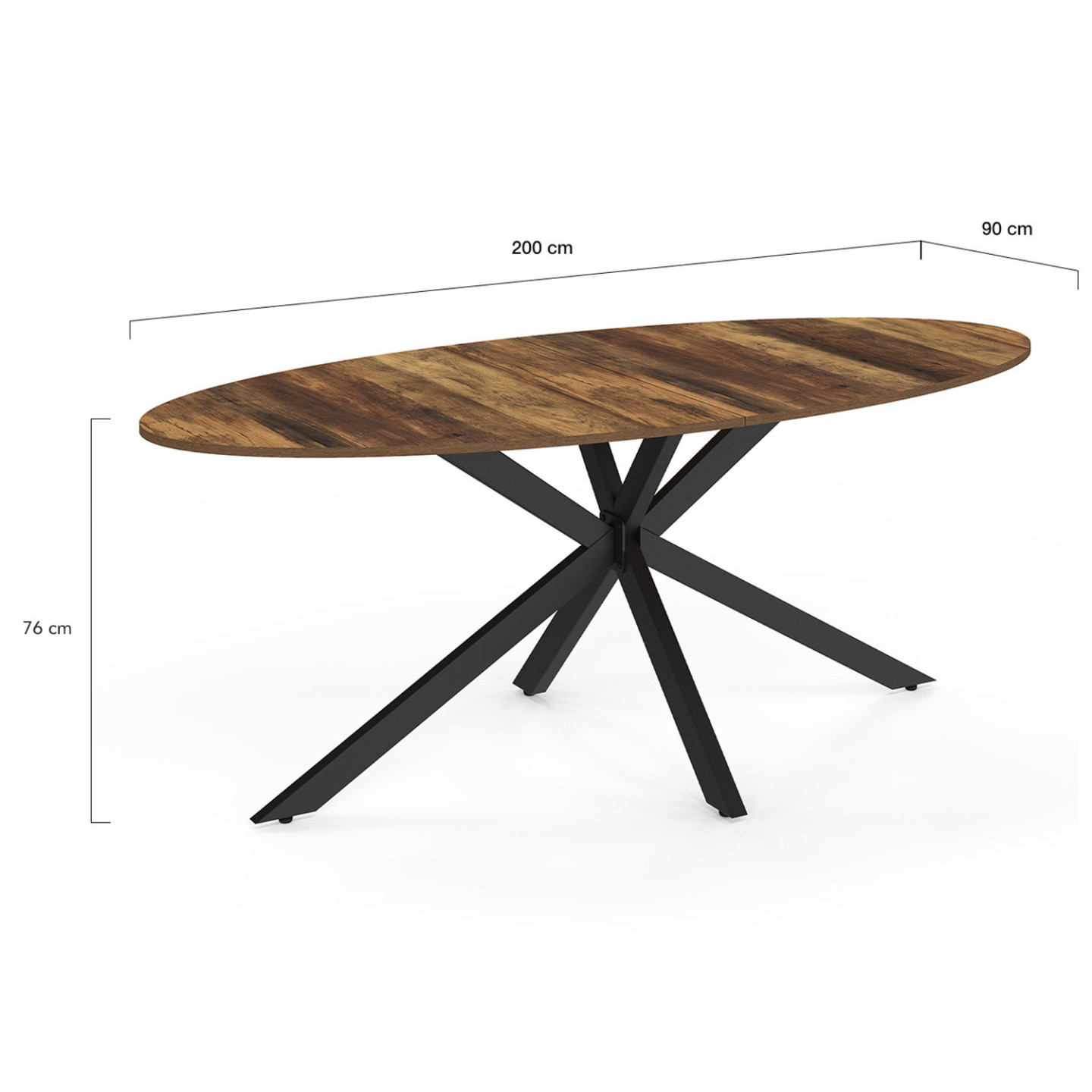 Le design industriel vintage s'invite dans votre salle à manger avec cette table ALIX 200 cm avec plateau ovale ! Sa forme originale et son pied central design apporteront une touche de caractère et d'élégance à votre pièce !Le plateau effet bois foncé et le pied métal noir s'associent pour un design rustique et un esprit authentique qui se mariera parfaitement avec votre décoration intérieure.Pour vous permettre de partager de bons moments en famille ou entre amis, la table ALIX est dotée d'un plateau de 200 cm x 90 cm qui offre une capacité d'accueil de 10 convives ! Son pied araignée en métal noir lui apporte une touche d'originalité et le plateau ovale lui confère, quant à lui, une allure massive des plus esthétiques !Sa structure en MDF est robuste et son pied en métal noir lui assure une très bonne stabilité.Optez pour le style rustique et craquez pour la grande table à manger ALIX plateau ovale 200 cm !Dimensions de la table ALIX plateau ovale bois foncé et métal 200 cmDimensions globales : Longueur 200 cm x largeur 90 cm x Hauteur 76 cmDimensions des pieds : 6 x 3 cmMatériaux : MDF + métalColoris : bois foncé et noirPlateau coupé en 2À monter soi-mêmeRetrouvez l'ensemble de notre collection industrielle sur notre boutique en ligne !