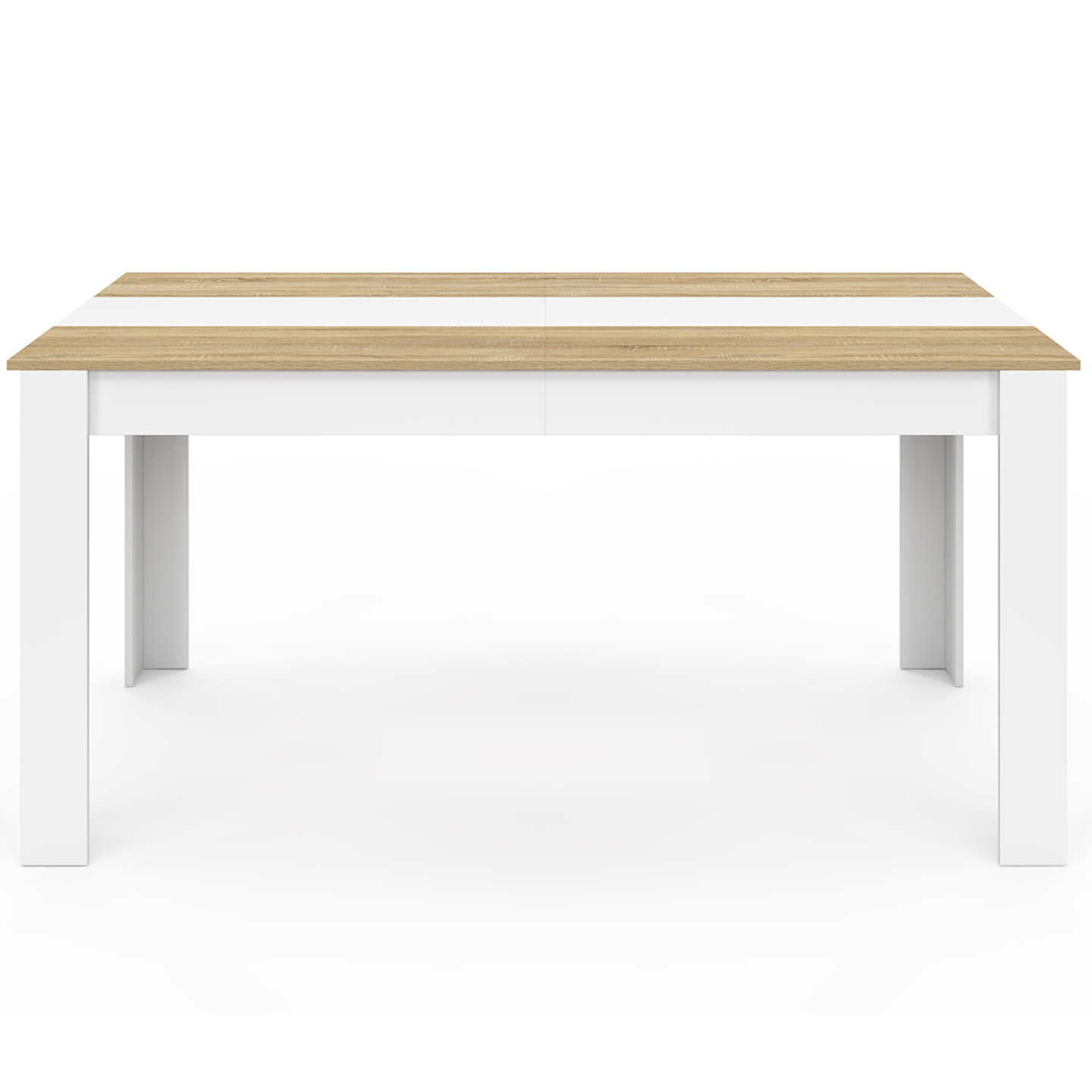 Vous êtes à la recherche d'une table à la fois tendance et pratique ? Découvrez la table à manger GEORGIA avec son plateau de 160 cm pouvant accueillir jusqu'à 8 personnes !Cette table en particules de bois au plateau bicolore apportera une touche chaleureuse et contemporaine à votre intérieur et se mariera à merveille avec votre mobilier !Son plateau blanc est composé de 2 coloris pour un aspect encore plus tendance ! Le détail en plus de cette table, c'est la ligne centrale en MDF blanche avec finition mat pour apporter une touche design. Ses dimensions compactes 160 x 75 cm vous permettront de recevoir confortablement jusqu'à 8 invités sans pour autant occuper trop de place dans votre salle à manger !Stable et robuste, la table est surélevée de 4 pieds en bois qui lui assurent une bonne stabilité.Craquez pour cette table à manger bicolore qui réchauffera l'ambiance de votre salle à manger.Dimensions de la table à manger GEORGIA 8 personnes blanche et imitation hêtreDimensions globales : Longueur 160 cm x largeur 80 cm x Hauteur 75 cmLargeur de la bande centrale : 26,5 cmMatériaux : panneaux de particules de bois (PB)Couleur : bois et blancÀ monter soi-mêmePlateau coupé en 2
