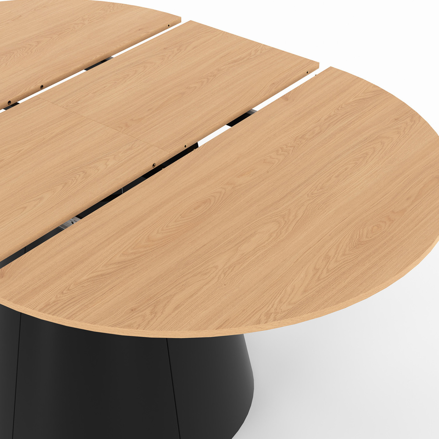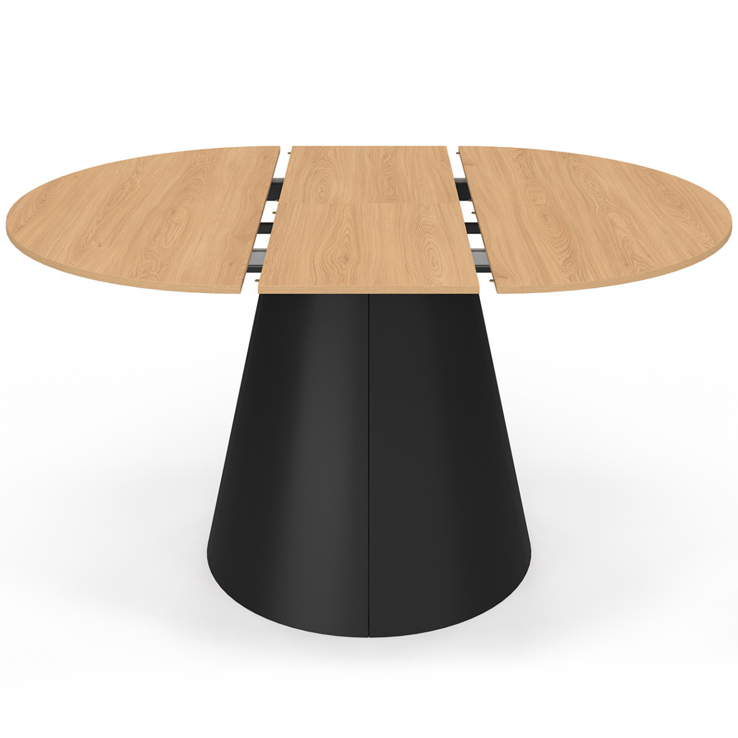 Craquez pour la table à manger ronde ANGELE et laissez entrer le style contemporain dans votre salle à manger ou votre cuisine !Cette table extensible bois et noir deviendra rapidement un élément phare de votre pièce dont vous ne pourrez vous passer ! Idéale pour les petits comme les plus grands espaces, la table à manger ANGELE avec son plateau extensible gain de place vous permettra de passer d'une capacité de 4 à 6, voire 8 personnes en un instant grâce à sa rallonge de 40 cm !Pratique et robuste, elle trouvera facilement sa place dans votre intérieur tout en garantissant une vraie stabilité !Ses courbes arrondies vous assurent d'être confortablement installé autour d'un repas convivial ou même d'un jeu de société avec votre famille ou vos amis.N'hésitez plus et optez pour cette table multifonction et design, parfaite pour le quotidien et les grandes occasions !Dimensions de la table à manger extensible ronde ANGELE 4-8 personnesDimensions globales : Longueur 110-150 cm x largeur 110 cm x Hauteur 75 cmDiamètre du pied : 70 cmMatériaux : Particules de bois (PB) mélaminé et base du pied en métalColoris : Bois et noirÀ monter soi-mêmeRetrouvez l'ensemble de notre collection contemporaine sur notre boutique en ligne !