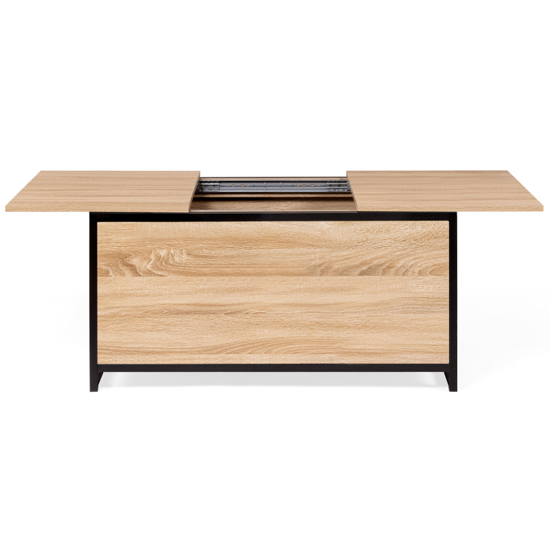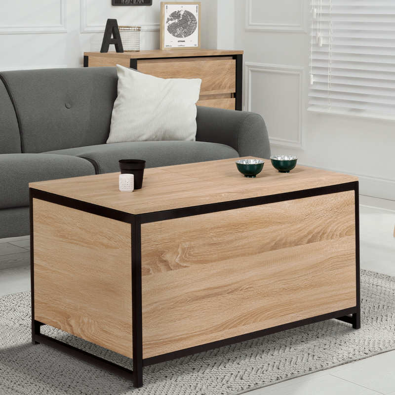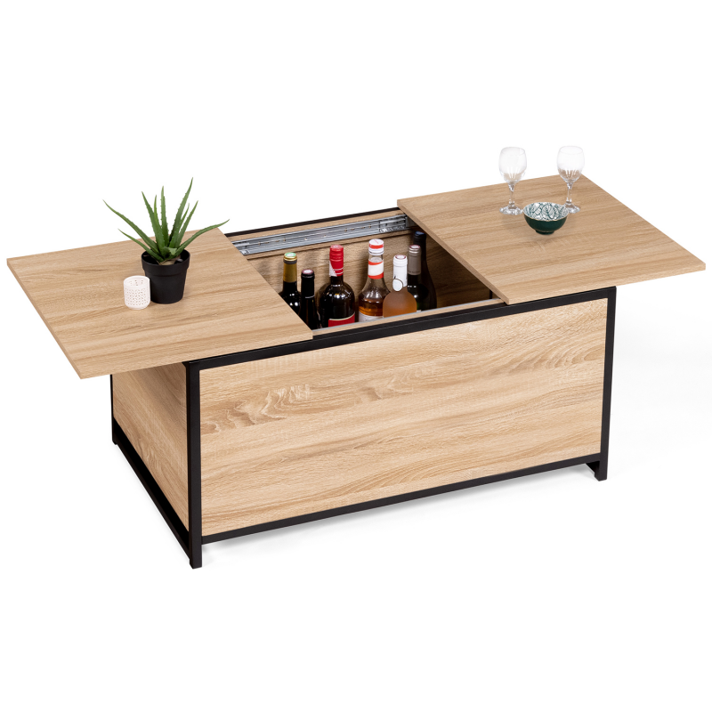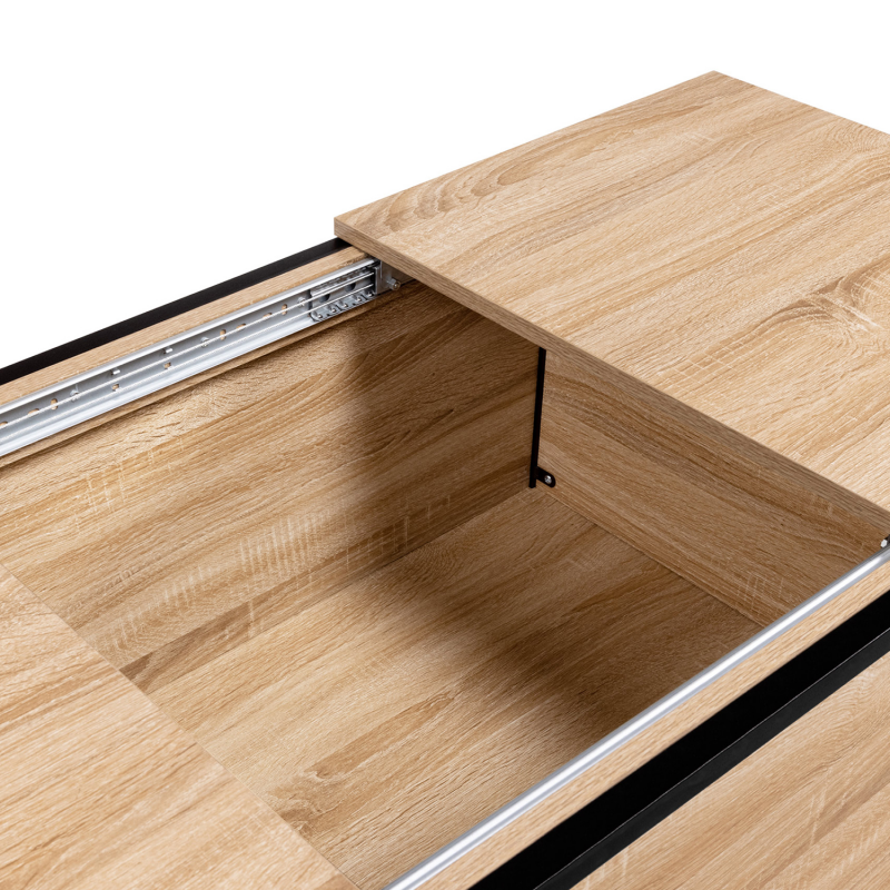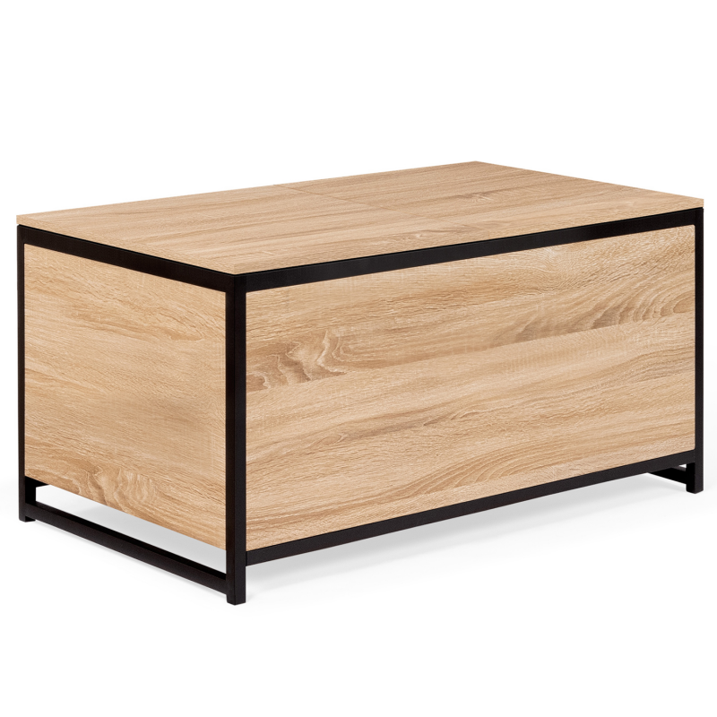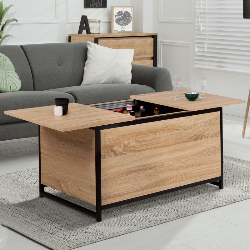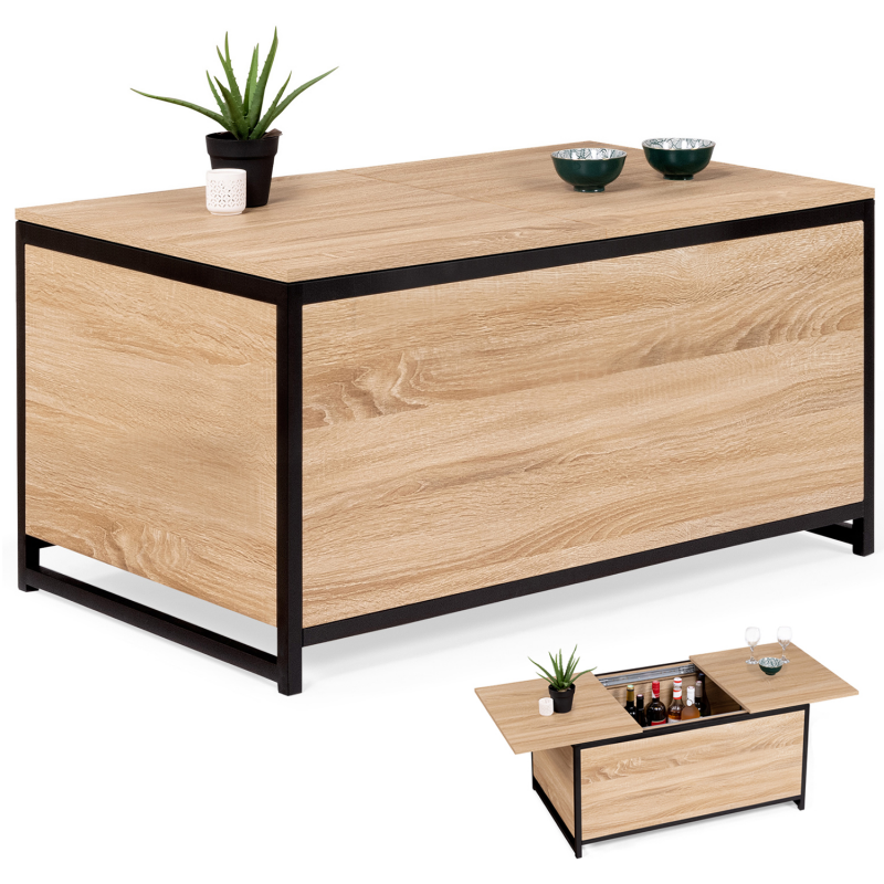Vous aimez recevoir famille ou amis dans votre salon pour un apéritif convivial ? Pour en finir avec les allers-retours à la cuisine, découvrez la table basse DETROIT bi-matière avec coffre intégré !Fonctionnelle grâce à son rangement astucieux caché sous plateau, elle permet de stocker les bouteilles pour l'apéritif façon mini-bar d'appoint. Des invités arrivent à l'improviste ? Tout est accessible et à portée de main ! Maxi capacité, rangez les objets les moins esthétiques, vos télécommandes et autres magazines à l'intérieur du grand compartiment central (profondeur 33,5 cm). Son système coulissant avec rails au niveau du plateau supérieur permet d'y accéder en toute facilité.Grâce à son grand plateau coulissant en particules de bois (épaisseur 1,5 cm), vous pourrez accueillir vos invités autour d'un apéritif ou tout simplement passer de bonnes soirées devant un plateau TV.Sa structure en métal noir (épaisseur 2 x 2 cm) lui assure stabilité et robustesse pour un usage au quotidien.Son format compact et ses coloris naturels passe-partout s'adapteront facilement à votre salon. Ambiance chaleureuse garantie !Profitez dès à présent d'une table basse pratique au design unique et tendance pour sublimer votre intérieur !Dimensions de la table basse de bar DETROITDimensions globales : Longueur 90 cm x largeur 55 cm x Hauteur 45 cmProfondeur du coffre : 33,5 cmHauteur des pieds : 5 cmÉpaisseur du métal : 2 x 2 cmÉpaisseur des plateaux bois : 1,5 cmÀ monter soi-mêmeDécouvrez l'ensemble de nos tables basses ainsi que notre collection industrielle sur notre boutique en ligne !