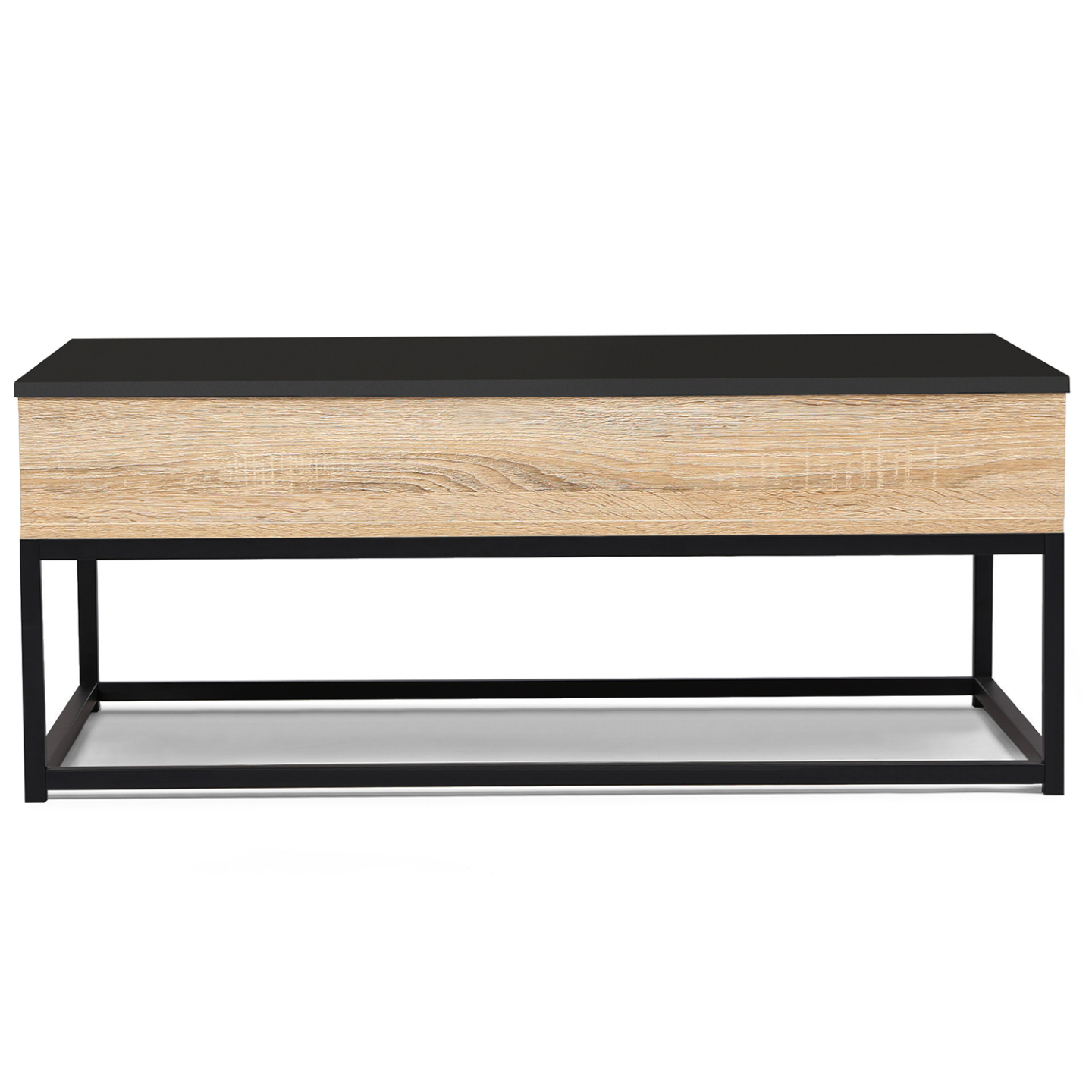 Laissez entrer le style industriel si tendance dans votre intérieur avec notre table basse bi-matière en métal et bois ! 2 en 1, voici la dernière génération de table basse astucieuse avec système de plateau relevable : d'une simple table basse, elle se transforme en table à manger !Pratique et déco, cette pièce maîtresse modernisera votre salon ! Les lignes et le style épuré donneront à votre intérieur un aspect loft du meilleur effet !Son plateau relevable noir, adaptable à toutes les situations, vous permettra d'organiser un apéritif entre amis, de prendre un repas ou une collation devant la télévision ou encore de vous aménager un coin bureau improvisé tout en gardant une position confortable dans votre canapé. Fonctionnelle, elle offre également une solution de rangement fermée grâce au compartiment situé sous le plateau. Rangez vos revues et télécommandes et gardez un espace libre pour poser vos plateaux télé ou votre ordinateur !Grâce à son mécanisme en acier laqué epoxy noir, le plateau de cette jolie table basse se relève en un clin d'oeil.Son plus : un petit rebord additionnel sur toute la longueur de table pour poser votre roman préféré ou votre tasse de thé et laisser l'espace du plateau libre pour vos couverts ou votre ordinateur !Une fois fermée avec ses lignes épurées et son plateau noir, cette table basse en bois et métal, au style industriel, apportera design et élégance à votre intérieur. Ses finitions soignées offriront à votre salon une touche de modernité ! La structure de cette jolie table basse bicolore, en panneaux de particules de bois (épaisseur 1,5 cm), lui confère stabilité et solidité.Optez pour l'ingéniosité de cette table basse à plateau relevable en bois ! Dimensions de la table basse plateau relevable industrielleDimensions globales : Longueur 100 cm x largeur 55 cm x Hauteur 40,5 cmDimensions de l'espace de rangement : L. 97 x l. 52 x H. 12 cmHauteur de la table une fois ouverte : 55 cmÀ monter soi-mêmeRetrouvez l'ensemble de notre collection industrielle sur notre boutique en ligne !