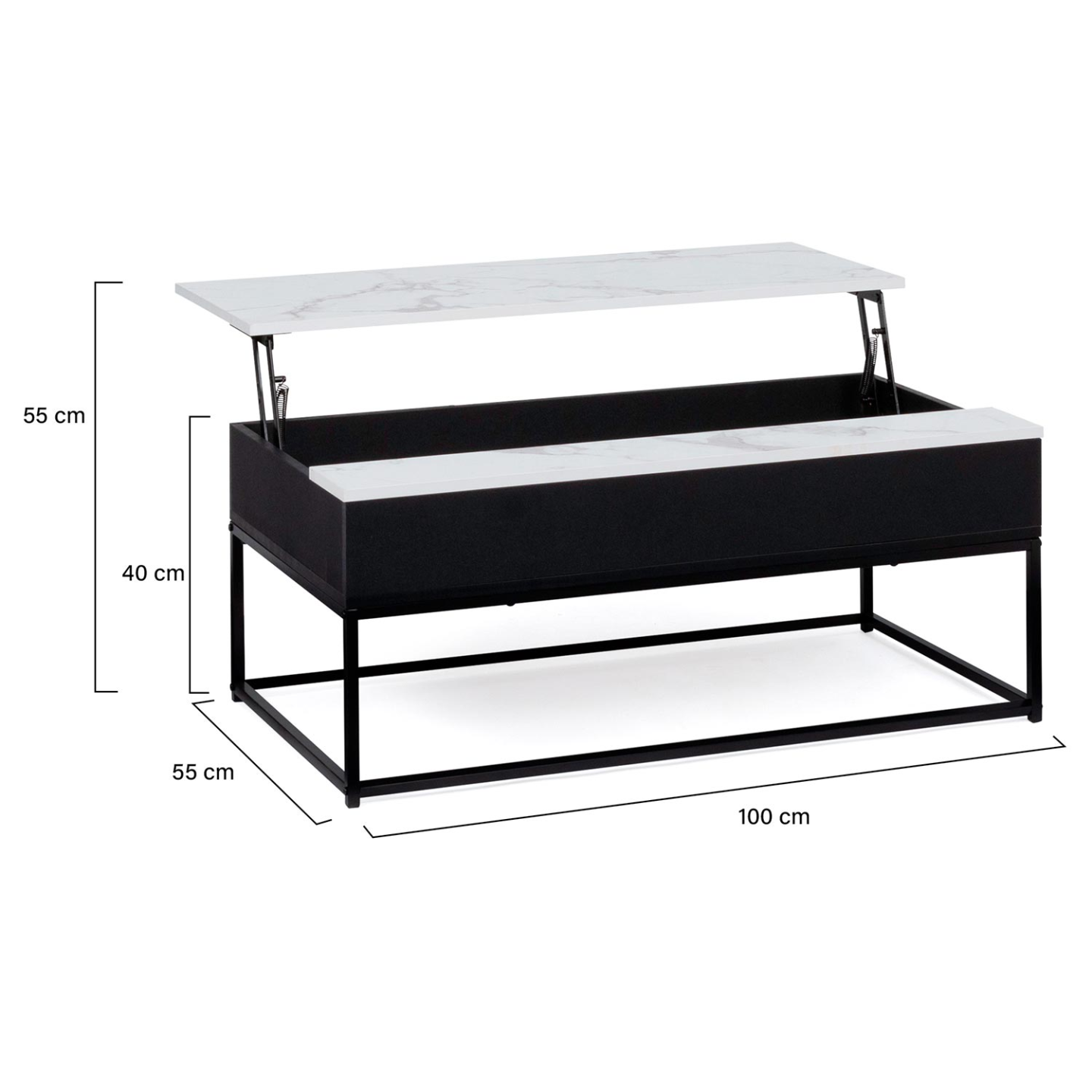 2 en 1, voici la dernière génération de table basse astucieuse avec système de plateau relevable : d'une simple table basse, elle se transforme en table à manger pratique !Son plateau relevable, adaptable à toutes les situations, vous permettra d'organiser un apéritif entre amis, de prendre un repas ou une collation devant la télévision ou encore de vous aménager un coin bureau improvisé tout en gardant une position confortable dans votre canapé. Fonctionnelle, elle offre également une solution de rangement fermé grâce au compartiment situé sous le plateau. Rangez vos revues et vos télécommandes et gardez un espace libre pour poser vos plateaux télé ou votre ordinateur !Grâce à son mécanisme en acier laqué epoxy noir, le plateau de cette jolie table basse se relève en un clin d'oeil.Son plus : un petit rebord additionnel sur toute la longueur de table pour poser votre roman préféré ou votre tasse de thé et laisser l'espace du plateau libre pour vos couverts ou votre ordinateur !Une fois fermée avec ses lignes épurées, cette table basse en bois et métal apportera une touche design à votre intérieur. Ses finitions soignées offriront à votre salon une touche de modernité ! La structure de cette jolie table basse, en MDF et pieds en métal 1,6 x 1,6 cm, lui confère stabilité et robustesse. La résistance des matériaux assure à votre table basse une excellente durée de vie !Optez pour l'ingéniosité de cette table basse au plateau relevable pour des soirées télé réussies assurées ! Sublimez votre intérieur avec ses matériaux bruts, ses formes simples et l'alliance du bois et du métal !Faites-vous plaisir grâce à cette table basse plateau relevable ALASKA, effet marbre et bois noir à prix mini !Dimensions de la table basse ALASKA plateau relevable effet marbre et bois noirDimensions globales : Longueur 100 cm x largeur 55 cm x Hauteur 40 cmHauteur du plateau relevé : 55 cm Dimensions coffre intérieur : L. 97 x l. 52 x H. 12 cmMatériaux : MDF épaisseur 1,5 cm et tubes en métal 1,6 x 1,6 cm Coloris : Plateau effet marbre blanc et pieds noirsÀ monter soi-mêmeDécouvrez l'ensemble de notre collection ALASKA ainsi que toutes nos tables basses sur notre boutique en ligne !