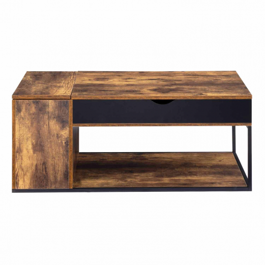 Style et gain de place sont les maîtres-mots de la table basse CHICAGO bois effet vieilli et métal noir à plateau relevable et coffre latéral.Avec ses nombreux espaces de rangement, elle sera un véritable atout pour un intérieur tendance et bien rangé ! Pour manger devant votre série préférée ou travailler confortablement depuis votre canapé, la table basse à plateau relevable CHICAGO sera parfaite pour vous.Parce que vous recevez sans doute des invités dans votre salon, la table basse bicolore noir et bois effet vieilli est dotée de plusieurs rangements pratiques.Idéal pour vos moments de détente, ce meuble est équipé d'un mécanisme en acier laqué époxy qui permet à la tablette de se relever pour une position confortable et dissimule un premier espace de rangement où vous pourrez y disposer vos livres, documents ou encore un plaid.Son coffre latéral d'une hauteur de 37 cm est parfait pour entreposer quelques bouteilles ainsi que le nécessaire pour l'apéritif !Enfin, son étagère inférieure basse offre quant à elle un espace ouvert où disposer télécommandes, programmes TV et magazines pour que rien ne traîne !Vous n'avez plus qu'à profiter des différentes solutions de rangement qu'offre cette table basse et à passer des moments agréables de détente ou de travail confortablement installé !Dimensions de la table basse plateau relevable CHICAGO avec coffreDimensions totales : Longueur 100 cm x largeur 55 cm x Hauteur 40 cmDimensions du plateau relevable : L. 74 x l. 55 cmHauteur plateau relevé : 54 cm Dim. intérieures de l'espace de rangement sous plateau relevable : L. 72,5 x l. 52 x H. 12 cm Dim. intérieures du coffre de rangement latéral : L. 24 x l. 51,6 x H. 37 cmMatériaux : Panneaux de particules mélaminés - épaisseur 1,5 cm et métal 1,6 x 1,6 cmColoris : bois vieilli et noirÀ monter soi-mêmeÀ associer avec le meuble TV CHICAGO 2 tiroirs et placard.Retrouvez l'ensemble de notre collection industrielle et de nos tables basses relevables sur notre boutique en ligne !