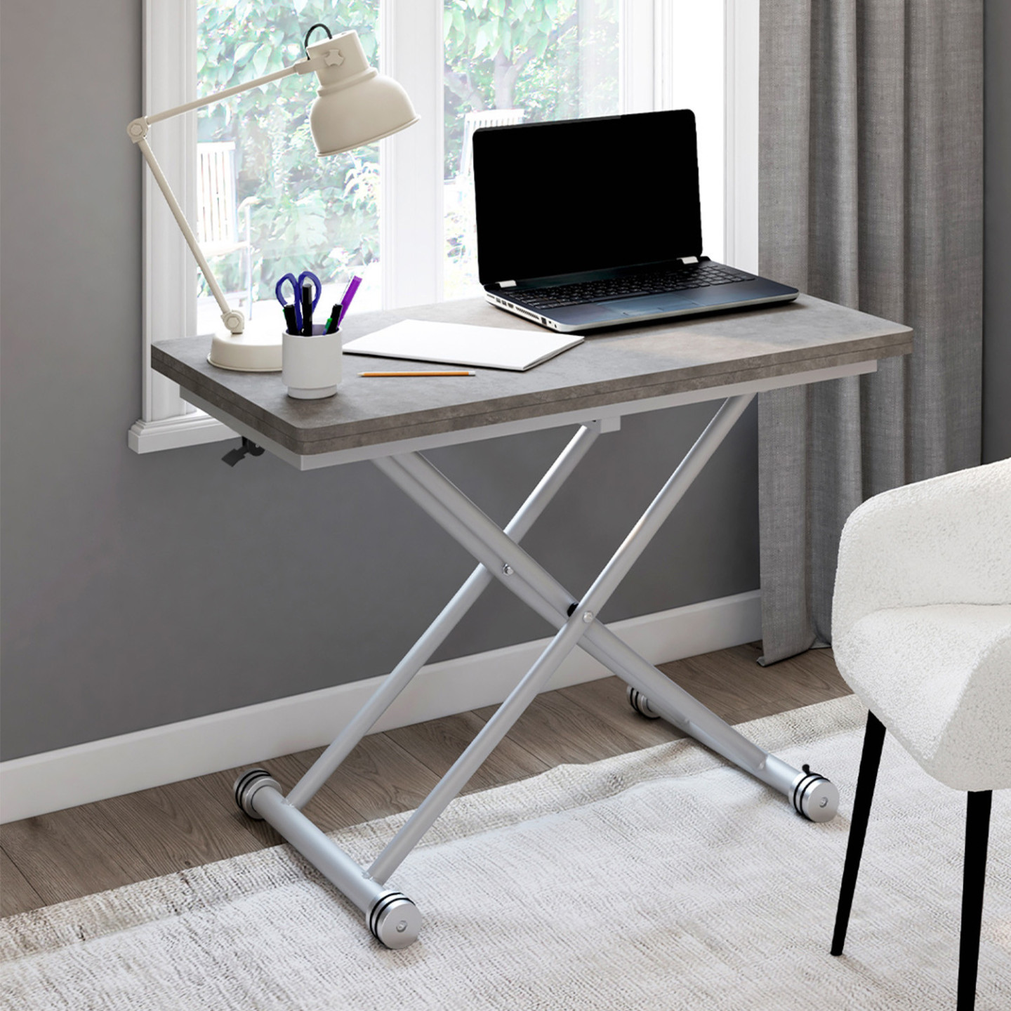 2 en 1 : laissez-vous séduire par la table basse URBANA et son système rehaussable associé à son pied articulé : d'une simple table basse, elle se relève et se transforme en table à manger en un clin d'œil ! Adaptable à toutes les situations, elle vous permettra d'organiser un apéritif entre amis, de prendre un repas ou une collation devant la télévision ou encore de vous aménager un coin bureau improvisé !Cette table URBANA est ergonomique et pratique dans les petits comme dans les plus grands espaces. Vous pourrez très bien l'utiliser dans une grande pièce, lorsque vous êtes nombreux pour votre repas et que vous avez besoin d'ajouter une table supplémentaire.Peu encombrante, vous pourrez aussi la transformer en fonction de vos besoins en table carrée ou rectangulaire. Elle peut également être utilisée comme table principale ou comme bureau dans un studio étudiant.Cette table modulable est idéale pour votre cuisine, salon ou encore salle à manger. Une fois dépliée, vous pourrez accueillir 6 à 8 personnes. Son mécanisme s'enclenche facilement à l'aide d'une poignée. Ajustez la hauteur des pieds à votre convenance et dépliez le plateau en le faisant pivoter pour passer à un grand plateau.De plus, ses roulettes permettent de déplacer la table basse URBANA facilement d'une pièce à une autre et sont équipées de freins afin d'assurer sécurité et stabilité à la table.Sublimez votre intérieur avec ses formes simples et l'alliance du plateau effet béton et du gris design.Dimensions de la table basse relevable URBANA plateau effet bétonDimensions de la table dépliée : Longueur 114 cm x largeur 100 cm x Hauteur 22 / 75 cmDimensions de la table pliée : L. 100 x l. 57 cm x H. 22 / 75 cmMatériaux : Fibres de bois (MDF) et métalColoris : plateau effet béton et pieds gris À monter soi-mêmeDécouvrez toutes nos tables basses plateau relevable sur notre site internet !