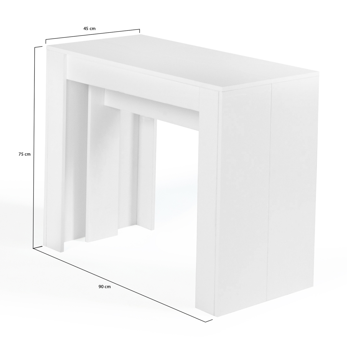 Vous êtes à la recherche d'un meuble ultra fonctionnel, multi-usage et tendance pour compléter votre mobilier et apporter une touche design à votre intérieur ? Découvrez la table console extensible ORLANDO en bois blanc qui saura répondre à toutes vos attentes !Dans sa version allongée, accueilliez jusqu'à 10 personnes autour de cette table à manger conviviale 235x90 cm ! Une fois repliée, servez-vous de cette console 90x45 cm comme meuble d'entrée pour disposer vide-poches, objets déco ou petites plantes. Ses lignes massives sublimeront votre entrée avec caractère. Pratique et gain de place par excellence, passez d'une fonctionnalité à l'autre facilement grâce à ses 4 rallonges de 47 cm chacune. Sa structure massive en panneaux de particules de 1,5 cm d'épaisseur lui apporte stabilité et robustesse.Profitez de dîners en famille ou entre amis sans encombrer votre intérieur grâce à cette table console extensible ORLANDO en bois blanc !Dimensions de la table console extensible 90-235 cmDimensions table étendue : Longueur 235 cm x largeur 90 cm x Hauteur 75 cmDimensions console repliée : L. 90 x l. 45 x H. 75 cm4 rallonges de 47 cm chacuneÀ monter soi-mêmeRetrouvez également l'ensemble de nos tables extensibles et notre collection design sur notre boutique en ligne !