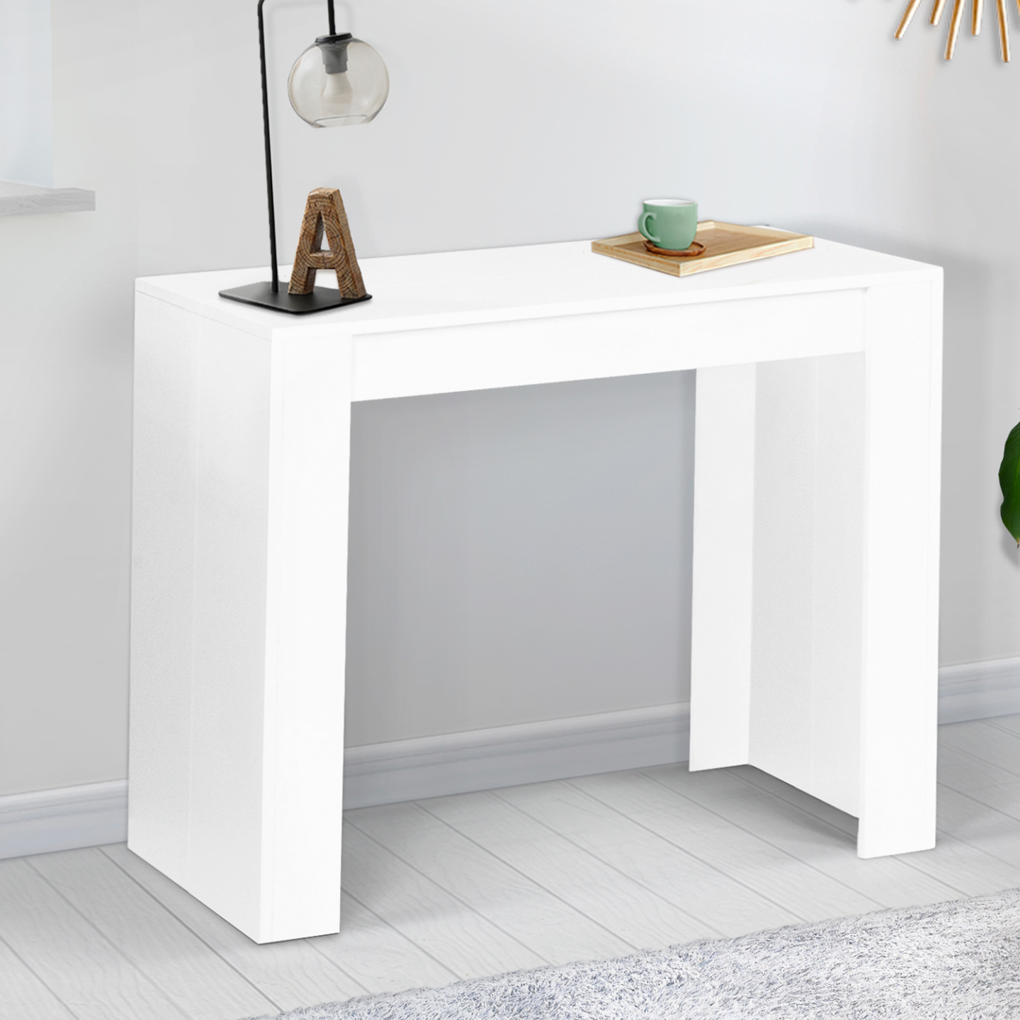 Descriptif de la table console extensible ORLANDO bois blancVous êtes à la recherche d'un meuble ultra fonctionnel, multi-usage et tendance pour compléter votre mobilier et apporter une touche design à votre intérieur ? Découvrez la table console extensible ORLANDO en bois blanc qui saura répondre à toutes vos attentes !Dans sa version allongée, accueillez jusqu'à 6 personnes autour de cette table à manger conviviale 140x90 cm ! Une fois repliée, servez-vous de cette console 90x45 cm comme meuble d'entrée pour disposer vide-poches, objets déco ou petites plantes. Ses lignes massives sublimeront votre entrée avec caractère. Pratique et gain de place par excellence, passez d'une fonctionnalité à l'autre facilement grâce à ses 2 rallonges de 47 cm chacune. Sa structure massive en panneaux de particules de 1,5 cm d'épaisseur lui apporte stabilité et robustesse.Profitez de dîners en famille ou entre amis sans encombrer votre intérieur grâce à cette table console extensible ORLANDO en bois blanc !Dimensions de la table console extensible 90-140 cmDimensions table étendue : Longueur 140 cm x largeur 90 cm x Hauteur 75 cmDimensions console repliée : L. 90 x l. 45 x H. 75 cm2 rallonges de 47 cm chacuneÀ monter soi-mêmeModèle également disponible en version 235 cm et 300 cm ainsi qu'en coloris bois façon hêtre