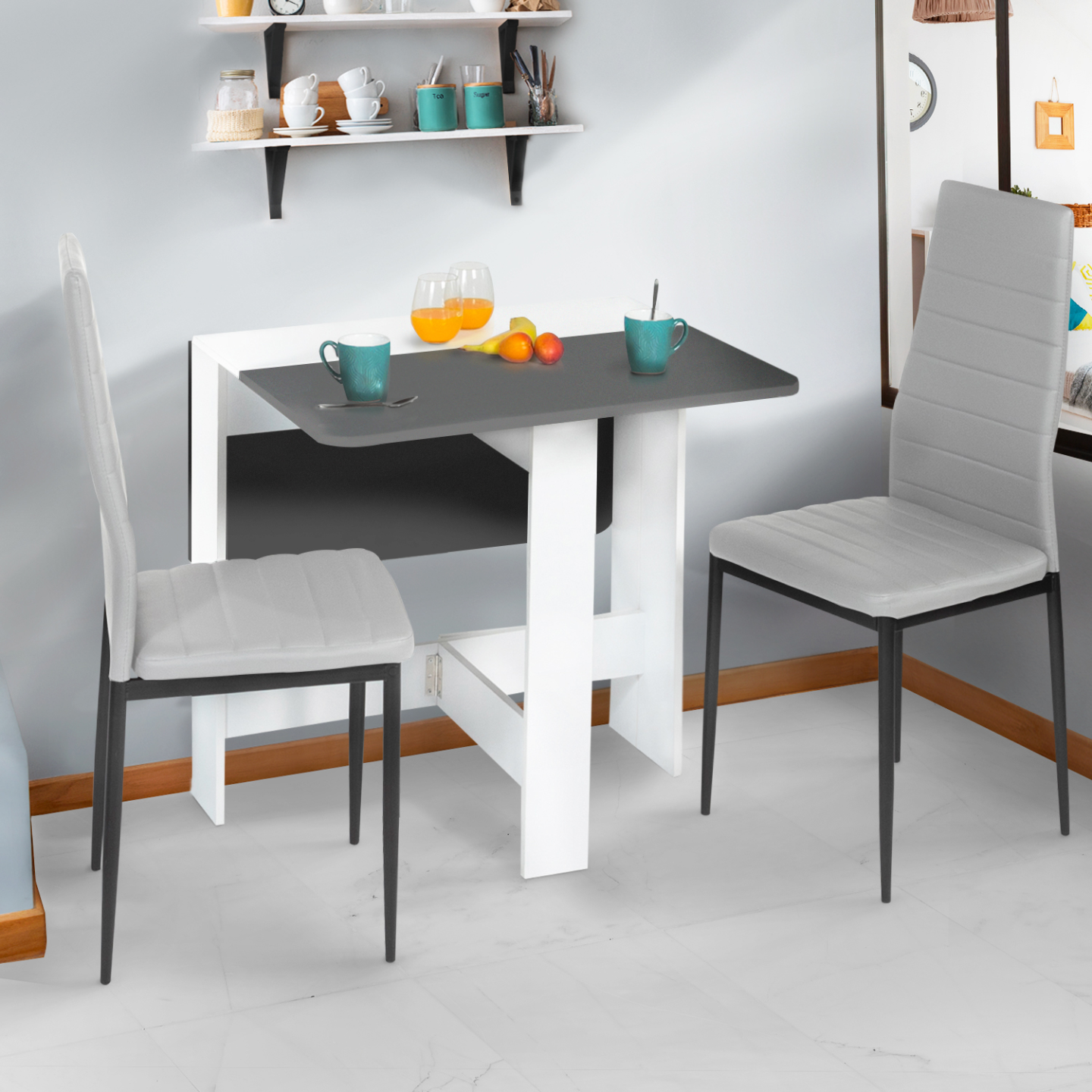 Descriptif de la table pliante EDIUltra moderne, la table à manger pliable bicolore EDI aux 2 rabats gris, une fois totalement dépliée, vous offrira l'effet d'un chemin de table avec sa bande blanche centrale. Idéalement conçue pour les studios ou les petits espaces de vie, elle se plie et se déplie en un clin d'oeil, pour recevoir vos proches à l'occasion.Ses 2 allonges intégrées la rendent multifonctions : table de salle à manger, table de cuisine, console, bureau d'appoint, selon vos besoins et la place dont vous disposez. Rabattez les plateaux des deux côtés ou d'un seul côté, pour accueillir de 2 à 4 personnes autour de la table.Peu profonde, une fois repliée en mode console, vous disposez d'un espace suffisant pour poser votre corbeille à fruits ou votre planche à découper sans trop encombrer votre cuisine.Transformée en table de travail, installez-vous avec votre ordinateur pour consulter vos mails ou trier vos documents.Astucieuse et fonctionnelle, cette table s'adapte facilement à toutes les pièces de votre intérieur, centrée ou placée le long du mur.Facile d'entretien, hyper pratique, modulable, une véritable table caméléon !Dimensions de la table pliante EDIDimensions dépliée : Longueur 103 cm x largeur 76 cm x Hauteur 75 cmDimensions repliée : Longueur 76 cm x largeur 27 cm x Hauteur 75 cm