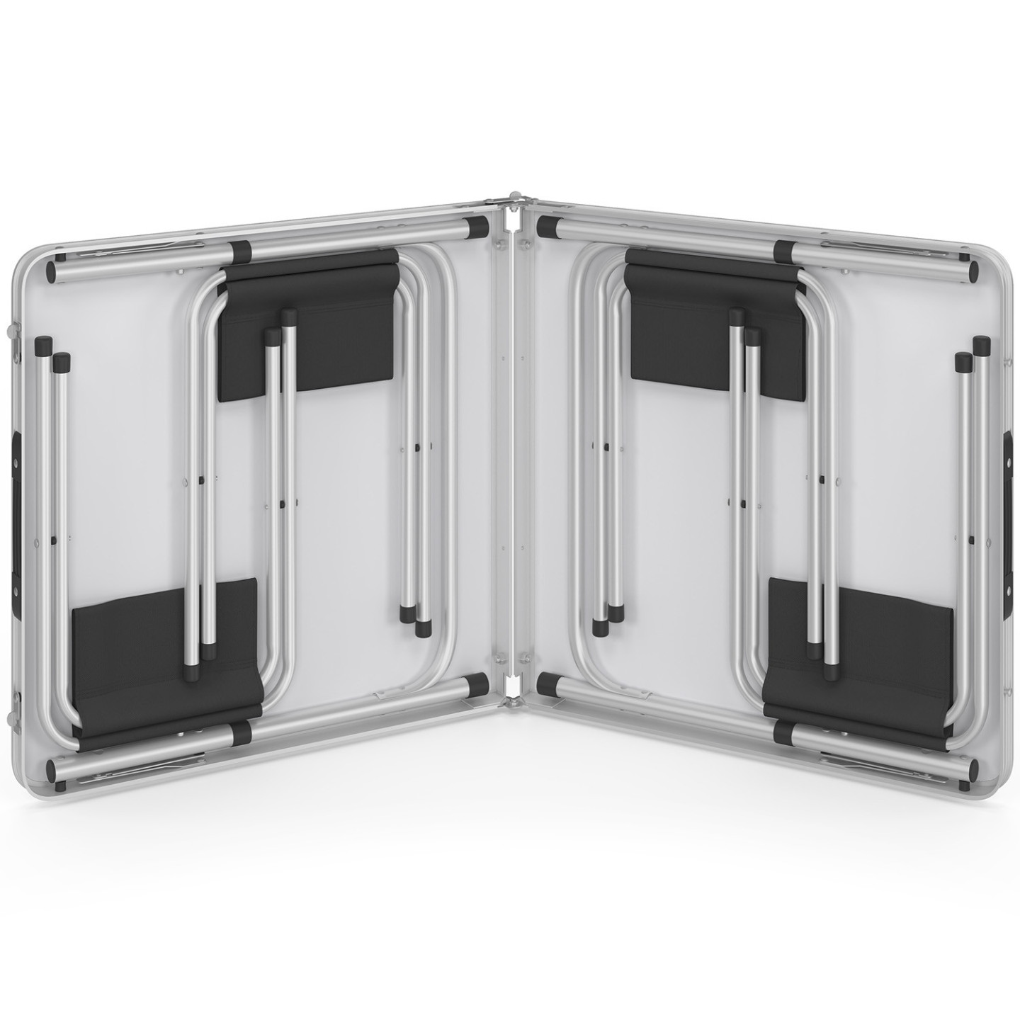 De par ses dimensions généreuses L. 120 cm x l. 60 cm et sa forme rectangulaire, cette table à manger peut accueillir 4 à 6 personnes pour des repas conviviaux.Idéale pour vos pique-niques, vos sorties en camping ou vos repas en extérieur, cette table de camping pliante ne nécessite aucun montage. Installez là en quelques secondes sans effort ! Son plateau en MDF et sa structure en aluminium assurent une grande stabilité et robustesse. Résistante aux intempéries et facile à nettoyer, la table de camping est idéale pour utilisation en extérieur. Réglez la hauteur de la table à manger entre 55 cm, 62 cm et 70 cm pour un confort adapté à chaque situation. Les tabourets pliants noirs sont fabriqués en tissu oxford 600D, connus pour leur solidité et leur confort. Leur design pliable permet un rangement rapide et compact. Une fois les sièges pliés et rangés sous le plateau, il ne vous reste plus qu'à plier la table. Une fois pliée sous forme de valise, vous pourrez emmener cet ensemble où vous voulez grâce à ses deux poignées de transport. L'ensemble de jardin se glisse facilement dans le coffre d'une voiture, un placard ou sous un lit.Recouvrez la table d'une jolie nappe et transformez-là en table d'appoint pour votre salon ! N'hésitez plus et optez pour la table de camping et ses tabourets pliants pour des repas conviviaux où que vous soyez ! Dimensions de la table à manger de camping et 4 tabourets pliants noirsDimensions de la table dépliée: Longueur 120 x largeur 60 x Hauteur 70 cmDimensions de la table pliée : L. 60 x l. 60 x H. 6 cmDimensions des tabourets : L. 28 x l. 28 x H. 35 cmHauteur de la table réglable sur 3 positions : 55 cm, 62 cm, 70 cmMatériaux : plateau en MDF, structure en aluminium, tabourets en tissu Oxford 600DColoris : noir et gris4 tabourets inclusA monter soi-mêmeRetrouvez aussi tout notre mobilier d'appoint pliant sur notre boutique en ligne.