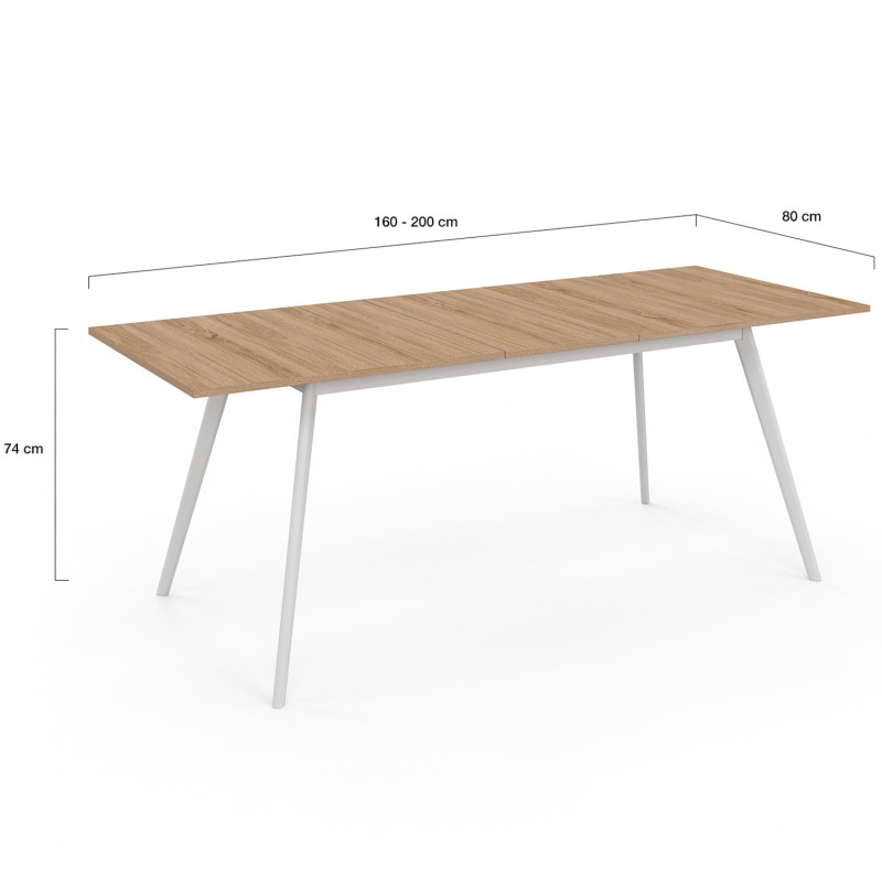 Le style nordique prend place chez vous avec la table à manger scandinave INGA plateau bois pieds blancs !Les lignes épurées de cette table, venues tout droit des tendances de décoration scandinave, apporteront une ambiance chaleureuse et cosy à votre intérieur. Son design raffiné et élégant s'adaptera parfaitement à votre cuisine ou votre salle à manger ! Stable et robuste, cette jolie table aux finitions soignées, est surélevée de 4 pieds en bois d'inspiration nordique.Son plateau, en panneau de particules de bois, a une finition bois pour un rendu chaleureux.Dépliez-le et obtenez une longueur généreuse de 200 cm grâce à son allonge pour recevoir tous vos hôtes !Son plateau supplémentaire, complètement mobile et détachable, se range sous la table, il n'y a donc pas besoin de prévoir d'endroit pour le stocker lorsqu'il n'est pas utilisé ! D'un format astucieux, sans son extension, elle n'encombrera pas votre espace de vie ! Gain de place et pratique, vous pouvez recevoir jusqu'à 10 invités autour de cette table extensible ! A vous les repas en famille ou entre amis réussis !Dimensions de la table scandinave 160-200 cmDimensions globales : Longueur 160/200 cm x largeur 80 cm x Hauteur 74 cmMatériaux : Plateaux en particules de bois mélaminé + pieds en bois de hêtreColoris : plateau bois et pieds blancsLa rallonge peut être rangée sous la tableÀ monter soi-mêmeCe modèle existe également en version 120-160 cm.Retrouvez tous nos coloris et dimensions de tables extensibles INGA sur notre boutique en ligne.