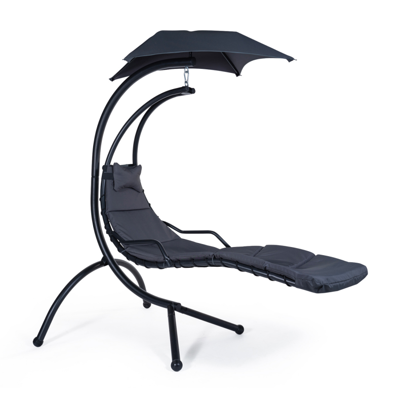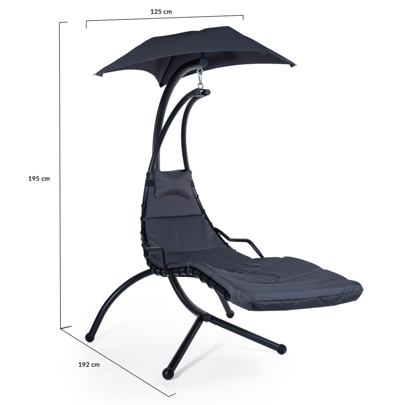 Prenez le temps de vous reposer cet été dans ce bain de soleil suspendu gris anthracite ! Avec son design tendance et sa structure en acier, ce transat et ses 4 pieds vous assurent robustesse et une parfaite stabilité. Avec son design sobre et moderne, ce transat suspendu s'accordera à merveille avec votre mobilier extérieur. Son assise ergonomique aux formes arrondies et son coussin gris anthracite au rembourrage moelleux vous garantissent un confort optimal pour de bons moments de détente sur votre terrasse.De plus, son pare-soleil en tissu polyester 180gr/m² de 100 x 100 cm vous protègera des UV pour un moment détente en tout sérénité ! Vous pourrez ainsi prendre le temps de lire un bon bouquin ou de vous reposer sereinement tout en vous protégeant des rayons du soleil.Fabriqué avec des matériaux de qualité, le bain de soleil en acier est robuste et peut soutenir jusqu'à 100 kg. De plus, un renfort en métal de part et d'autre du siège vient renforcer la structure pour encore plus de stabilité.Parfait pour un moment de tranquillité, profitez du confort de ce transat de jardin suspendu au look ultra design et contemporain, idéal dans votre jardin !Dimensions du bain de soleil suspendu gris anthracite- Dimensions totales hors tout : Longueur 192 CM x largeur 125 CM x Hauteur 195 CM- Dimensions du pare soleil : L. 100 x l. 100 CM- Hauteur de la surface de couchage au sol : 60 CM- Structure en acier et peinture époxy- Coussin en polyester 180 gr/m²- Couleur : gris- Capacité de charge maximale : 100 kgRetrouvez également tous nos fauteuils de jardin disponibles sur notre boutique en ligne !