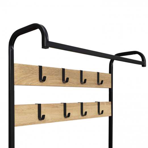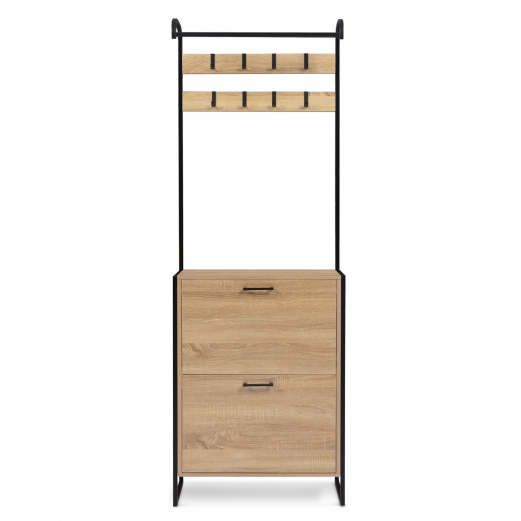 Grâce au meuble d'entrée LUIS, tout est à portée de main ! Accrochez vos vestes et manteaux à ses 8 patères tout en rangeant vos chaussures dans l'un des deux tiroirs.Vous pouvez y ordonner jusqu'à 12 paires de chaussures, 6 paires par compartiment. Profitez du dessus du rangement à chaussures pour poser vos clés ou votre sac à main. Les 8 patères du portant, en métal noir permettent de suspendre facilement et rapidement vos manteaux, vestes, écharpes, sacs et autres vêtements.Toute la famille trouvera une place pour ranger son manteau ou ses chaussures à l'abri de la poussière ! Les 2 espaces de rangement à chaussures sont séparés par une cloison intermédiaire pour organiser votre dressing à chaussures. Le format des portes, gain de place et astucieux, permet une ouverture facilitée.Organisez votre entrée tout en restant tendance, le design bois et métal du vestiaire LUIS apportera une touche déco industrielle à votre intérieur. Profitez de ce splendide vestiaire d'entrée bois/métal pour embellir votre intérieur, recevoir les affaires de vos invités, ou organiser votre rangement dans une buanderie, une entrée ou une chambre à coucher.Dimensions du vestiaire d'entrée LUISDimensions hors tout : Longueur 63,5 cm x largeur 23,5 cm x Hauteur 180 cmDimensions meuble chaussures : L.63,5 x l.23,5 x H.85 cmBarre de penderie : 60 cmPanneaux de particules de bois (PB) : 15 mm / 12 mmMétal : 16 mmÀ monter soi-même Retrouvez l'ensemble de nos meubles à chaussures et de nos vestiaires et meubles d'entrée sur notre boutique en ligne !
