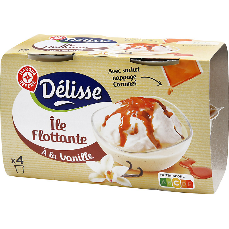 Île flottante sur lit de crème anglaise 95 % : lait écrémé pasteurisé, crème pasteurisée, blanc d'œuf 16,2 %, sucre, jaune d'œuf 6,1 %, amidon modifié de pomme de terre, arôme naturel de vanille, stabilisant: gomme xanthane, gousses de vanille épuisées et broyées.