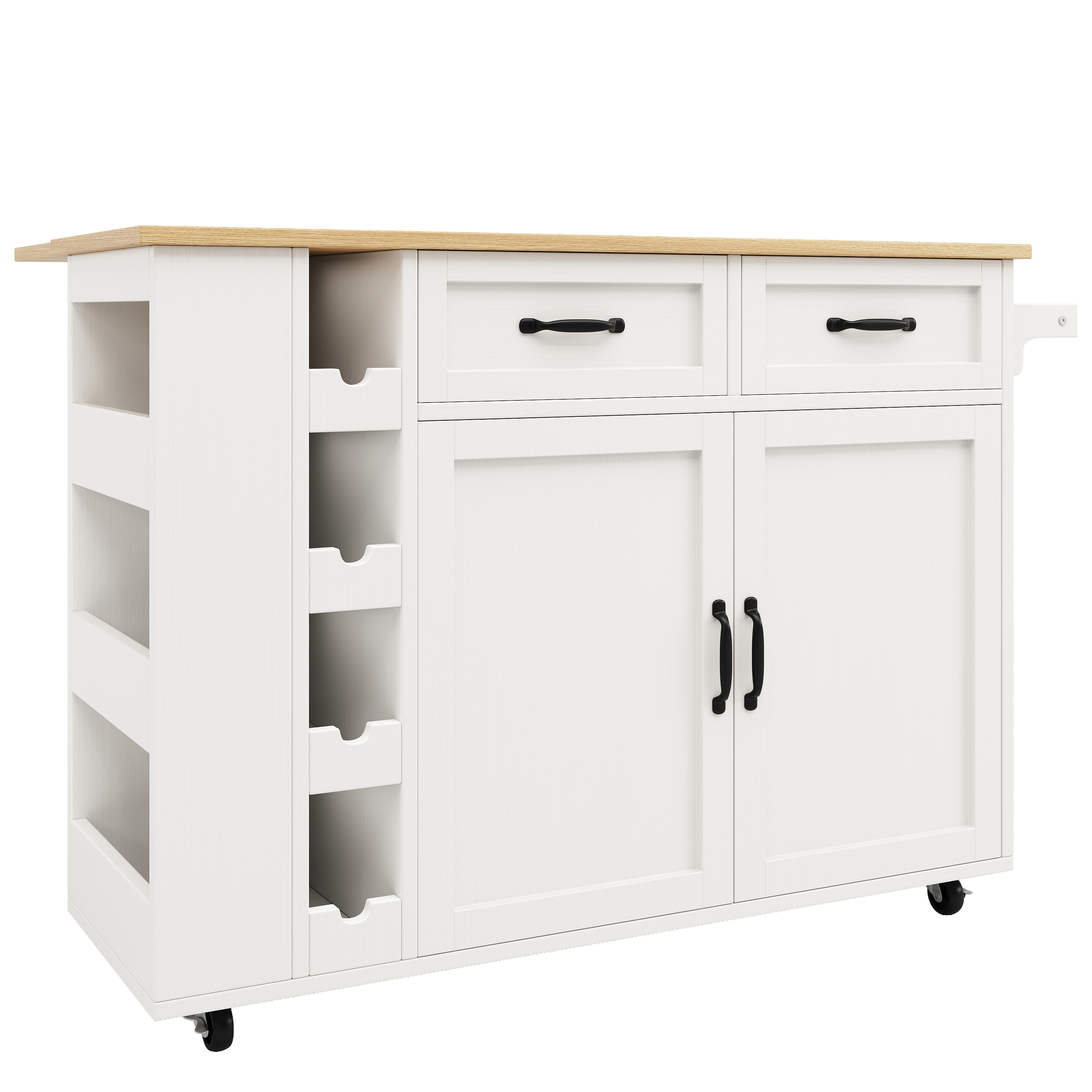 Équipé d'étagères et de porte-serviettes de chaque côté, cet îlot de cuisine offre un espace de rangement extrêmement pratique. Les étagères permettent de ranger épices, couverts et autres ustensiles, tandis que les porte-serviettes permettent de suspendre facilement torchons et serviettes.