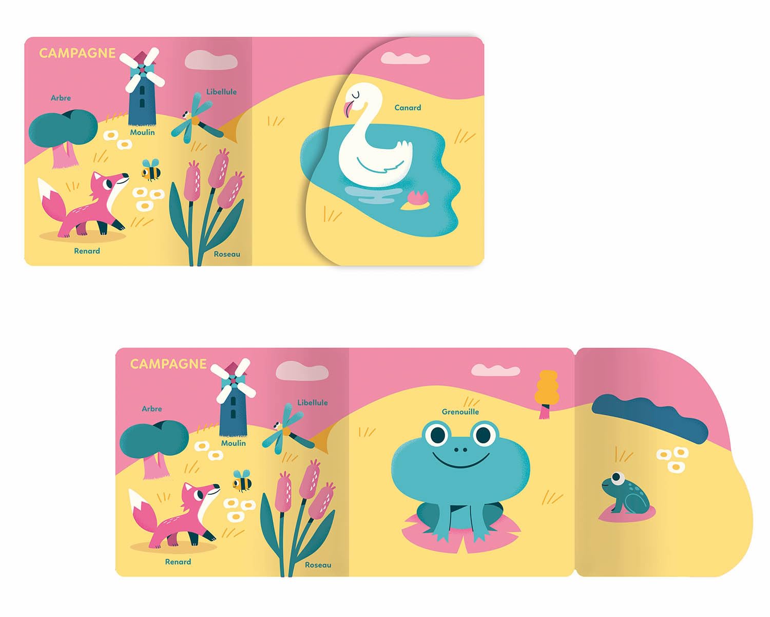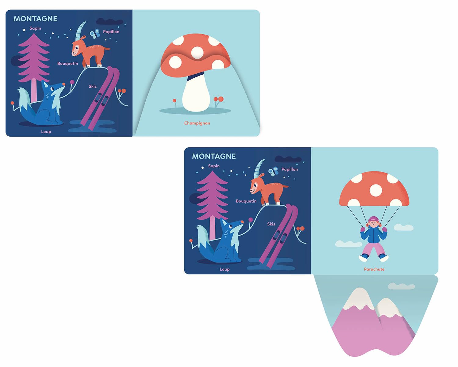 Un premier imagier à flaps pour apprendre en s'amusant : un imagier thématique en page de gauche et, en page de droite, une illustration d'un mot de cette thématique qui se transforme en une autre illustration (accompagné d'un autre mot, de la même thématique) grâce à des rabats.
