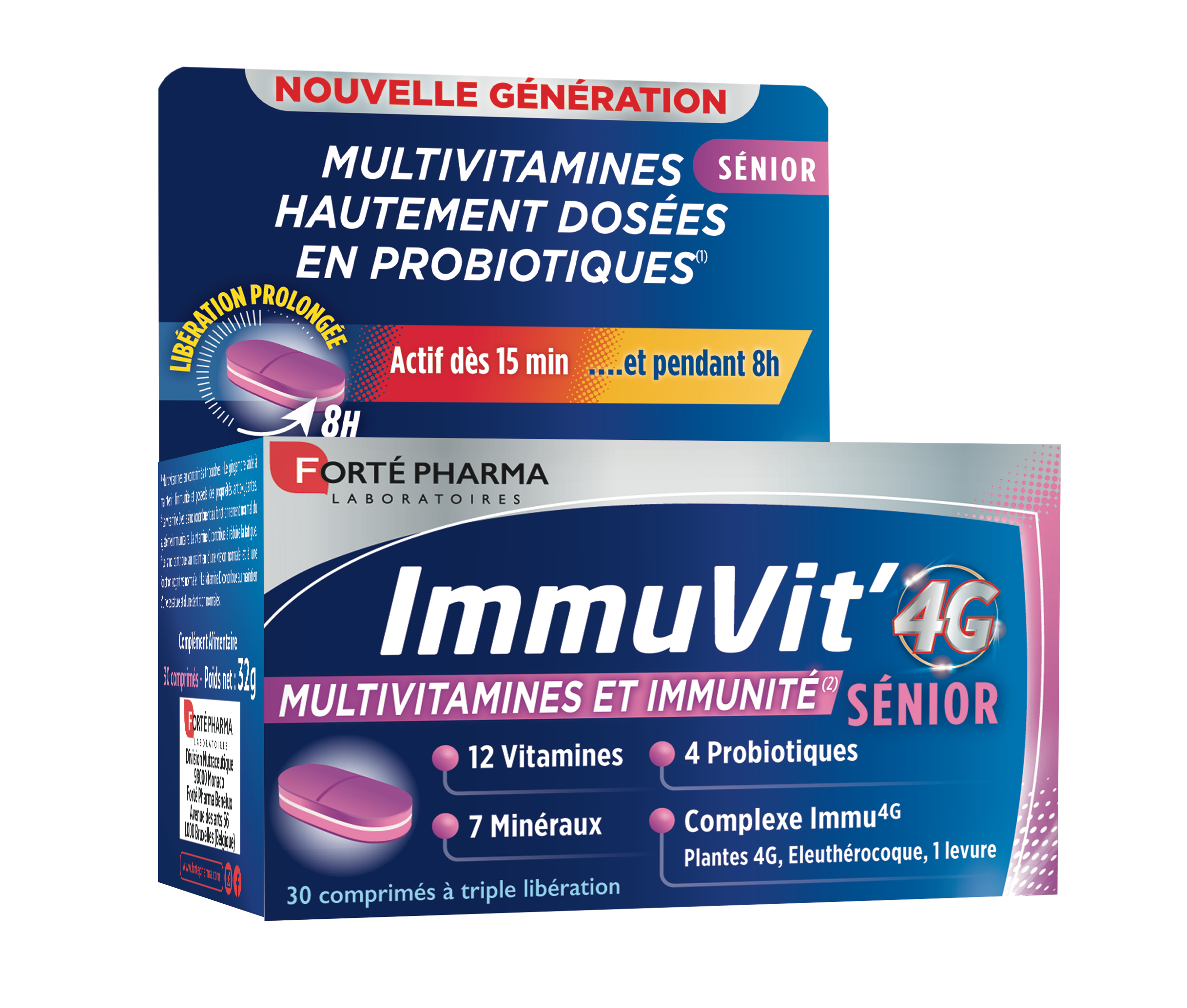 Changements de saison, déficits d'apports nutritionnels, stress ou fatigue… ces aléas de la vie peuvent affaiblir vos défenses naturelles et impacter votre forme et vos activités quotidiennes. Changements de saison, déficits d'apports nutritionnels, stress ou fatigue… ces aléas de la vie peuvent affaiblir vos défenses naturelles et impacter votre forme et vos activités. ImmuVit’ 4G associe 12 vitamines + 7 minéraux + 4 souches microbiotiques (200 millions d'UFC**) micro-encapsulées + un complexe à base de 4 plantes. Une formule unique, idéalement dosée et renforcée en Eleuthérocoque, en Vitamine D et en Zinc, pour maintenir chaque jour vos défenses naturelles(1), et stimuler votre vitalité(2). Son comprimé tricouche offre une triple libération des actifs pour une assimilation optimale par l’organisme, avec une action immédiate puis prolongée pendant 8 heures !