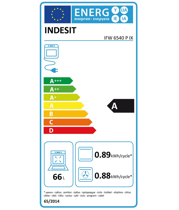 Indesit IFW6540PIX. Taille du four: Moyenne, Type de four: Four électrique, La capacité totale de l'intérieur du four (s): 66 L. Placement de l'appareil: Intégré, Couleur du produit: Acier inoxydable, Type de commande: Rotatif. Type d'horloge: Électronique, Type de minuterie: Numérique. Classe d'efficacité énergétique: A, Consommation d'énergie (conventionnelle): 0,89 kWh, Consommation d'énergie (convection forcée): 0,79 kWh. Type de lampe: Halogène