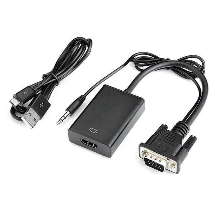 Adaptateur VGA vers HDMI vous aide a raccorder un ancien PC avec interface VGA a un nouvel ecran en HDMI. Support de l'audio via cable Jack stereo. Alimentation via port USB