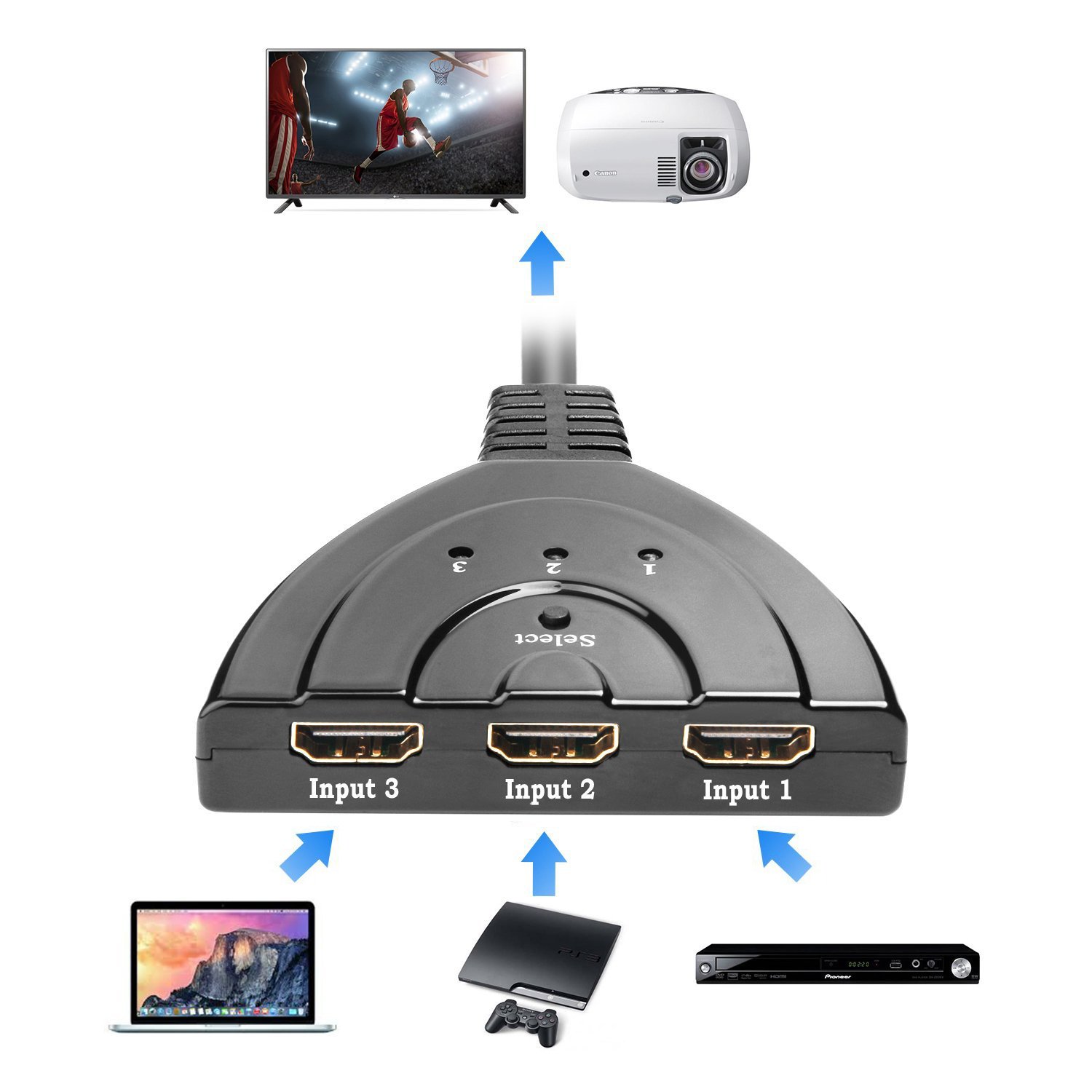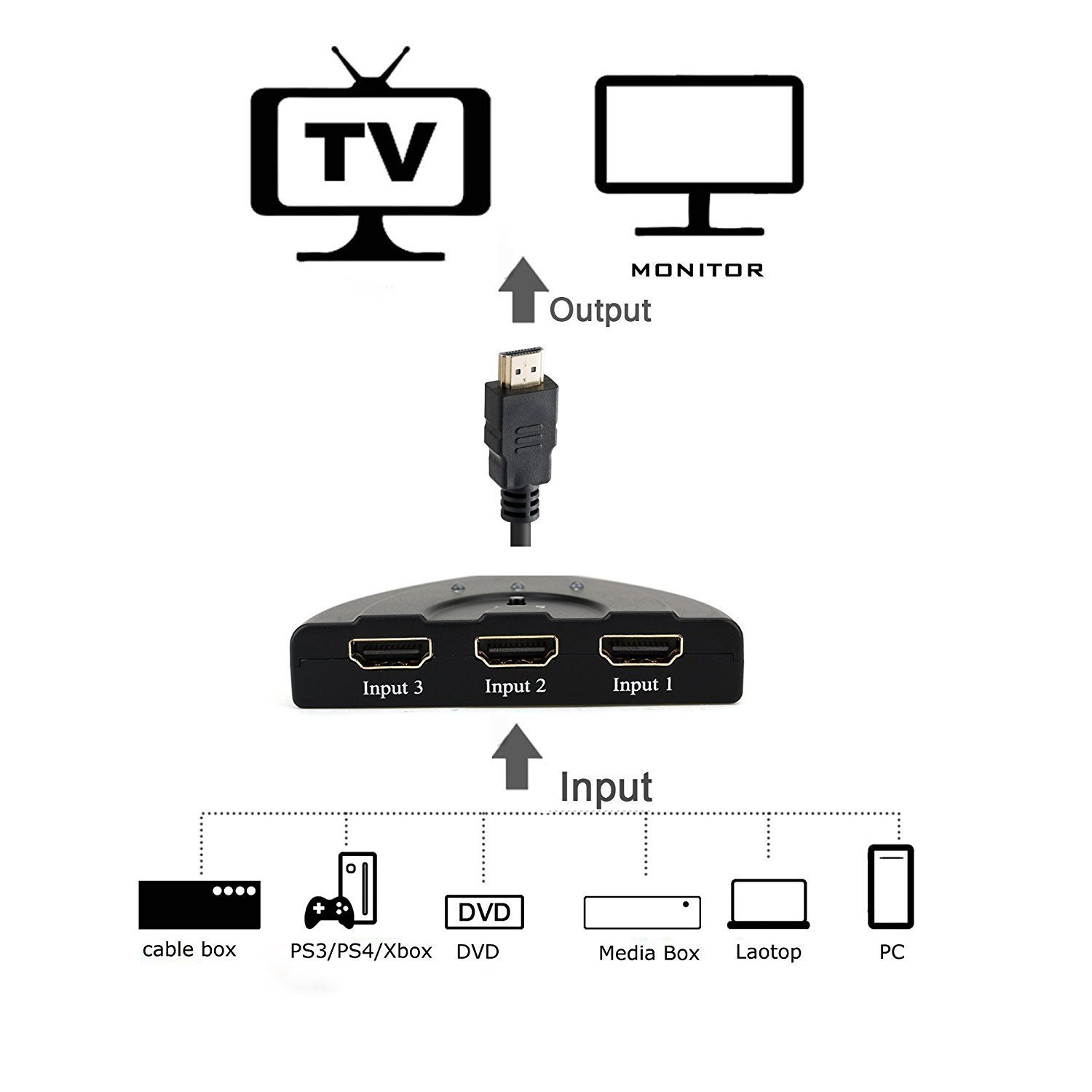 Passer le carrousel d'imagesLe commutateur HDMI sert a connecter plus d'appareils source sur un seul ecran (televiseur, projecteur ou moniteur LED). Ce commutateur avec 3 ports d'entree peut connecter 3 peripheriques en meme temps, ce qui peut eviter des deconnexions et des reconnexions frequentes. economisez votre temps et votre argent. Compatible avec : Peripheriques d'entree HDMI: Lecteur DVD, Lecteur HD-DVD, Lecteur Blue-Ray, Camescope, Recepteur SAT, Appareil photo numerique, PC, MAC portable, XBOX360, PS3, PS4, Nintendo Wii U, ordinateur portable, PC, TiVo, Vizio, Sony et bien d'autres. Peripheriques de sortie HDMI : TV LCD, televiseur plasma, TFT, projecteur, HD-Ready ou FULL HD TV. Il convient a tous les appareils HDMI