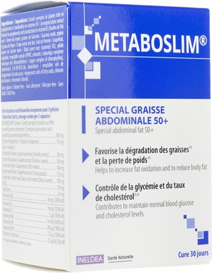 METABOSLIM®, la seule réponse naturelle et complète pour prévenir et traiter le Syndrome Métabolique. Les Laboratoires INELDEA, experts en micronutrition et en santé naturelle ont élaboré METABOSLIM® une formule unique à l’efficacité cliniquement prouvée* et sans effets indésirables. Composé d’un actif breveté 100% d’origine naturelle à l’efficacité démontrée, le METABOSLIM Complex®, ainsi qu’une association de Vitamines & Chrome pour une triple action : Action 1 > Favoriser la dégradation des graisses et la perte de poids. Action 2 et 3 > Contrôler les taux de sucre, triglycérides et cholestérol.