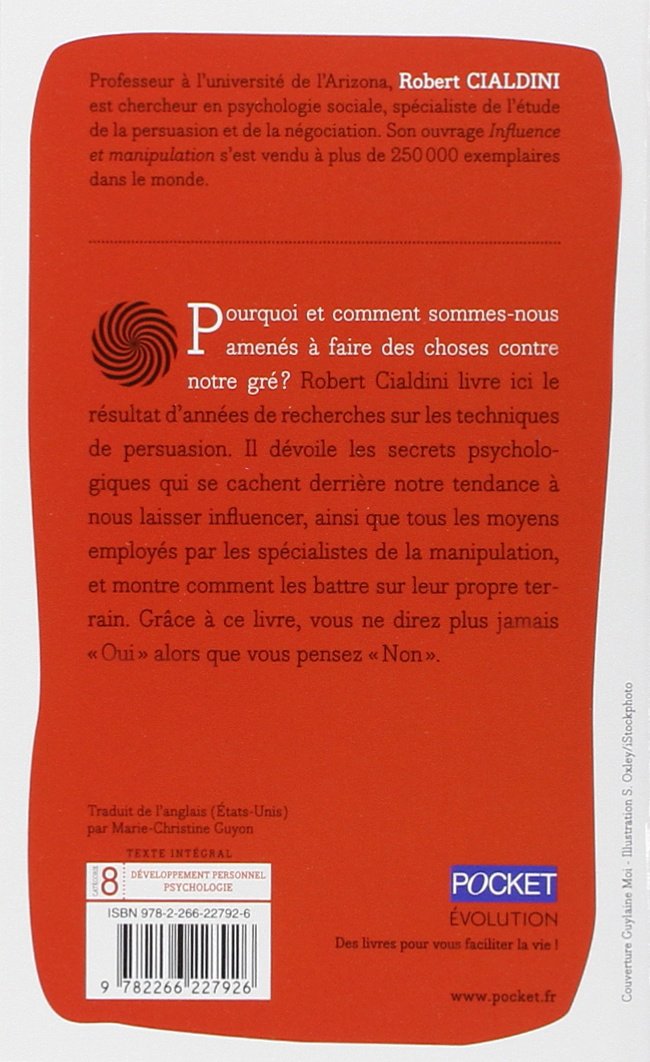 Pourquoi et comment sommes-nous amenés à faire des choses contre notre gré ? Robert Cialdini livre ici le résultat d'années de recherches sur les techniques de persuasion. Il dévoile les secrets psychologiques qui se cachent derrière notre tendance à nous laisser influencer, ainsi que tous les moyens employés par les spécialistes de la manipulation, et montre comment les battre sur leur propre terrain. Grâce à ce livre, vous ne direz plus jamais «Oui» alors que vous pensez «Non».