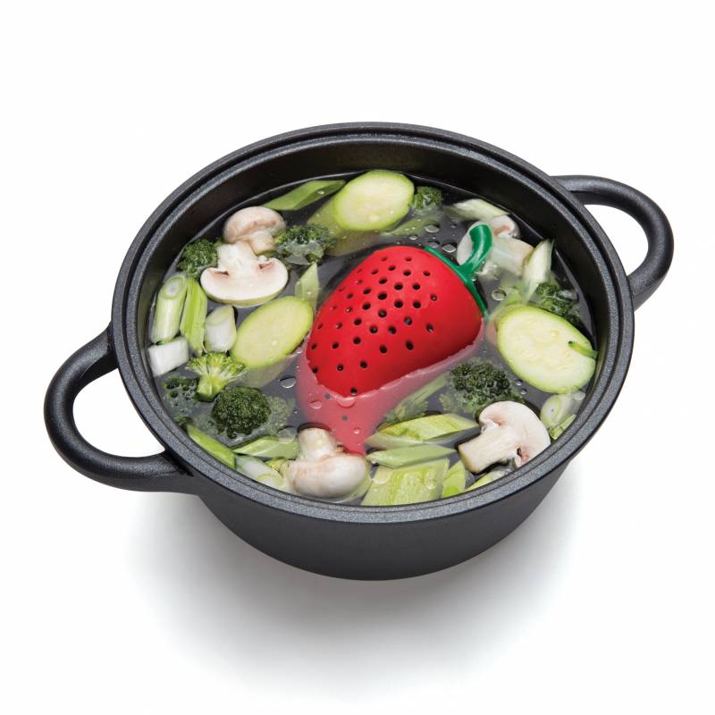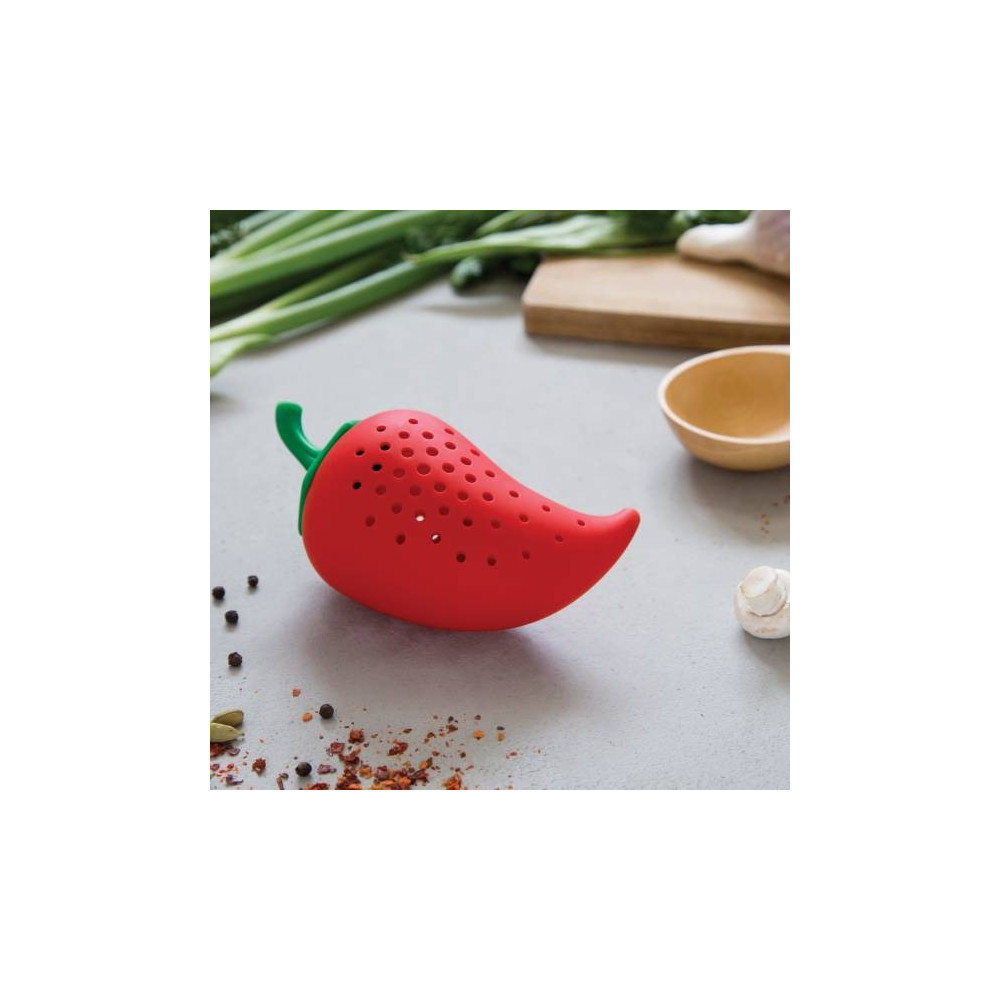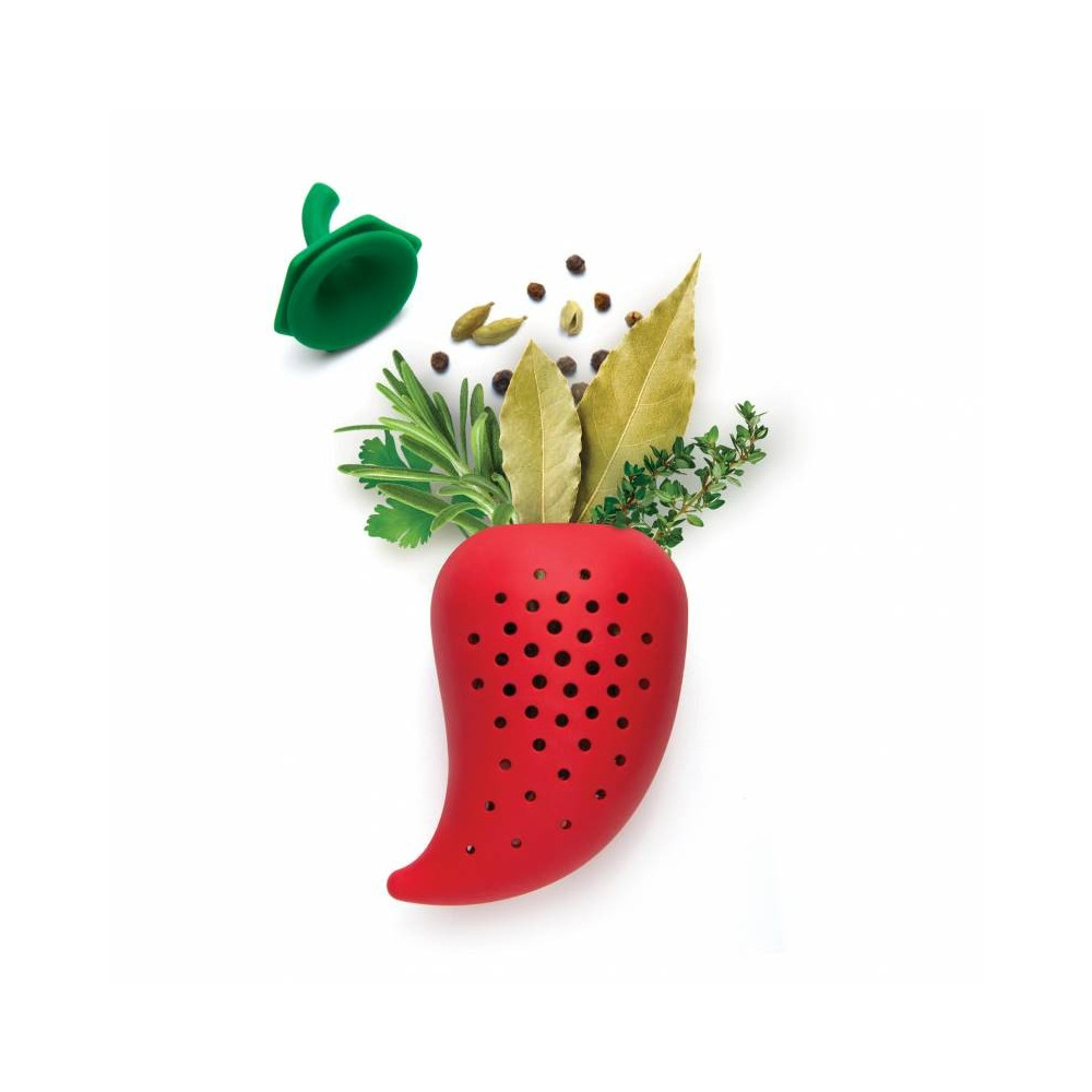 Idée géniale et très originale. Enfermez vos herbes, épices ou bouquets garnis dans la piment, laissez infuser le temps voulu et retirez le tout très facilement ! Dimensions : 14,5 x 8 x 6cm Matière : silicone alimentaire Résiste à l'eau bouillante