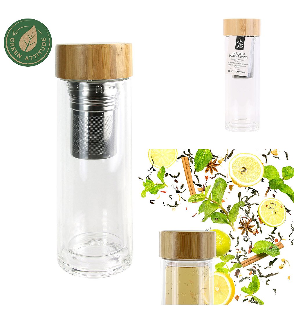 Infusez avec style vos thés ou autres boissons maison avec cet infuseur à double paroi. Il offre un design en bambou et en verre qui donnera un air chic à vos pauses gourmandes. Contenance : 330 ml.