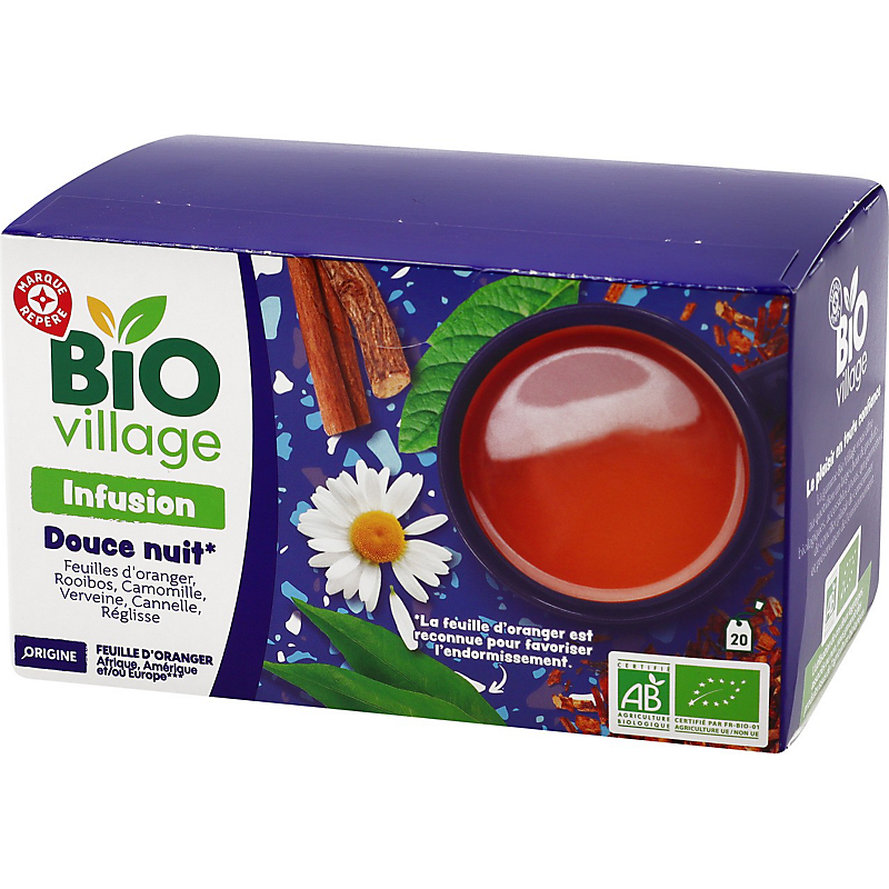 | Origine des principaux ingrédients | FEUILLE D'ORANGER, CAMOMILLE, VERVEINE ORIGINE : AFRIQUE, AMERIQUE ET/OU EUROPE*, ROOIBOS ORIGINE : AFRIQUE DU SUD, CANNELLE ORIGINE : AFRIQUE ET/OU ASIE*, REGLISSE ORIGINE : AFRIQUE, ASIE ET/OU EUROPE* * SELON LES APPROVISIONNEMENTS ET/OU LES CARACTÉRISTIQUES GUSTATIVES RECHERCHÉES |