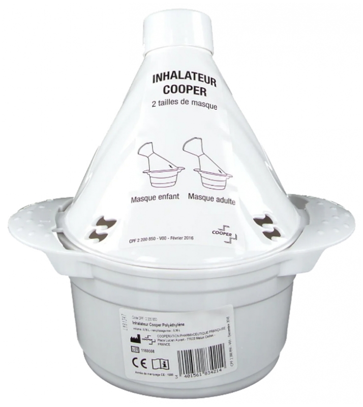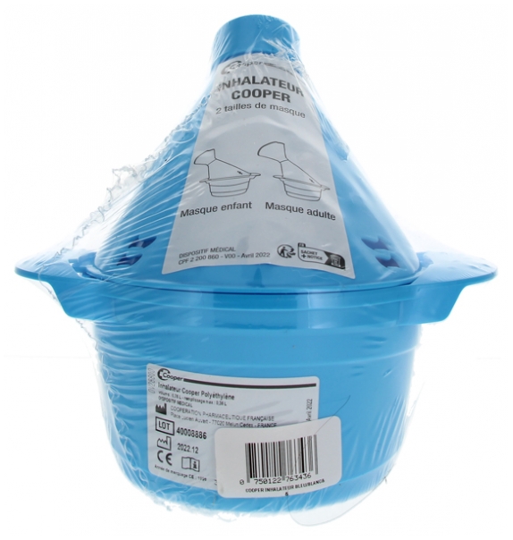 L' Inhalateur polyéthylène de Cooper permet de faire facilement des inhalations sans risque de brûlures, en cas d'affections ORL (Oto-rhino-laryngologie : oreille, nez, larynx). Le bol passe au micro-ondes. Réservoir de 500ML pour mettre l'eau chaude et les huiles essentielles telles que la solution pour inhalation