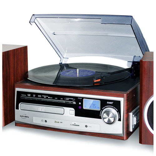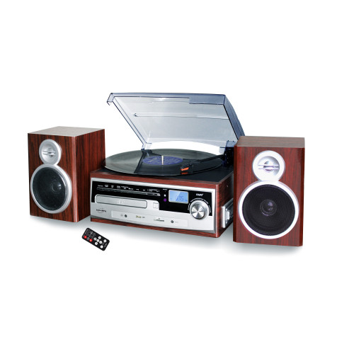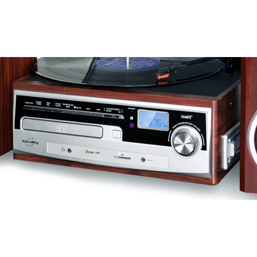 INOVALLEY CH14E Chaîne HiFi vintage avec encodage - Fonction encoding : enregistre vos vinyles, vos K7 audio, vos CD, et la radio en format MP3 - Lecteur CD - Platine tourne-disque vinyle 78, 45, et 33 tours - Lecteur K7 (cassette) audio - Radio AM / FM - Recherche auto des stations - Port USB / Port carte SD - Affichage LED - Haut-parleurs 2x40 watts - Prise casque - Finition plaquage bois