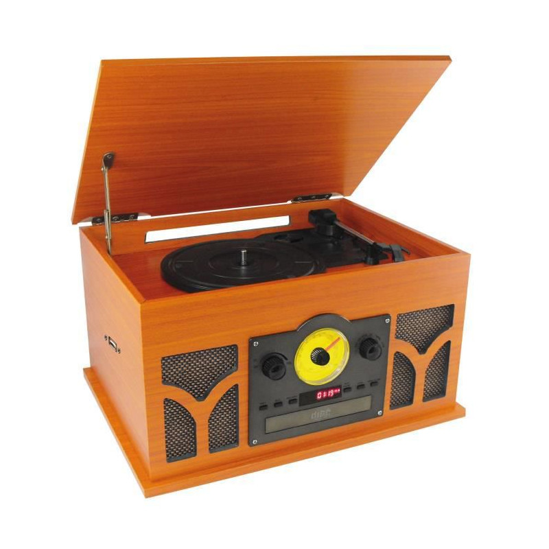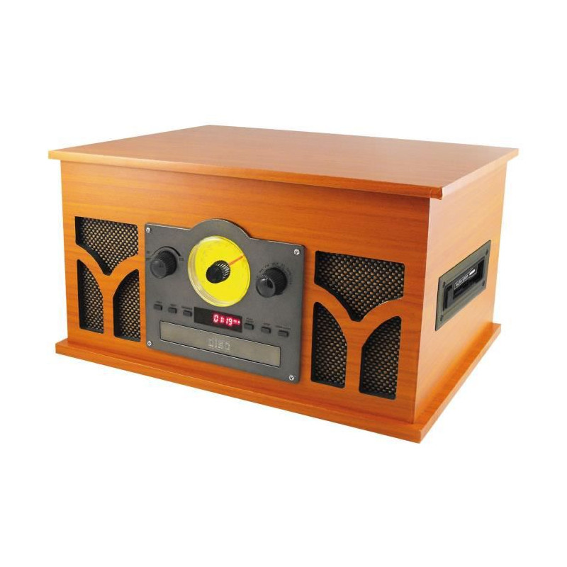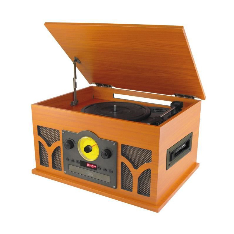 Chaîne HIFI rétro Bluetooth - Fonction Encoding : encode vinyle, CD, K7 audio, FM, AUX-IN par USB en format MP3 - Haut-parleurs 2x20 W - Port USB 2.0 - Platine vinyle 45, 33 et 78 tours - Lecteur CD, K7, Radio FM - Entrée AUX-IN - Adaptateur secteur, adaptateur 45 tours et câble audio inclus