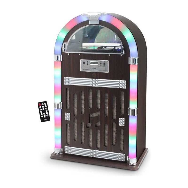 Connectivité Bluetooth - Haut-parleurs 2 x 30 Watts - Platine disque 33/45/78 tours - Lecteur CD - Lit CD/CD-R/CD-RW (NE LIT PAS LE MP3) - Radio FM - Entrée AUX-IN 3.5mm - Entrée RCA - Ecran LCD - Façade lumineuse (ON/OFF) - Fonctionne sur secteur - Télécommande et câble AUX-IN 3.5mm fournis - Finition bois