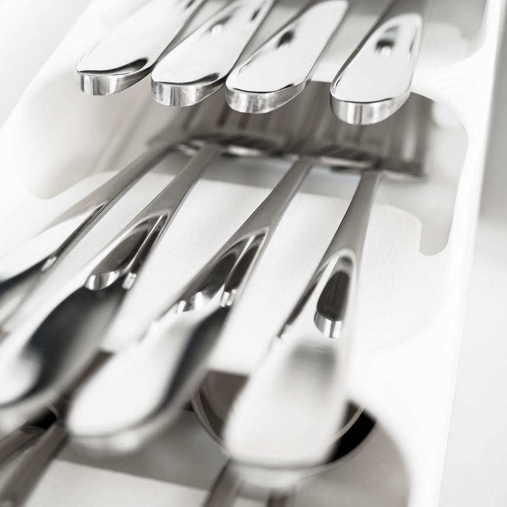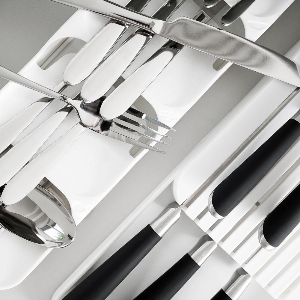 CUISINE - L'organisateur pour couverts assurera l'ordre dans le tiroir. L'organisateur mesure 39 x 11,5 x 5,5 cm. Parfait pour ranger cuillères, fourchettes, couteaux, petites cuillères et fourchettes. DURABLE - Fabriqué en plastique durable en blanc. CAPACITÉ - Il dispose de 5 compartiments pour le stockage. Avec son aide, les couverts auront la bonne place dans le tiroir. LA BONNE TAILLE - Grâce à sa conception, il prend très peu de place et est extrêmement spacieux. UNIVERSEL - L'organisateur a une dimension classique pour s'adapter à n'importe quel tiroir ou armoire. Nous y rangeons les couverts sur quatre niveaux. Range-couverts pratique. Il a un design approprié, il prend donc peu de place. Grâce à lui, les couteaux seront correctement rangés dans l'armoire et le design classique le fera rentrer dans n'importe quel tiroir. Le produit original de la marque Wilde. Fabriqué conformément aux normes européennes.