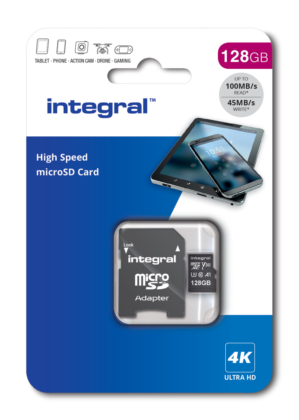 Integral INMSDX128G-100V30 128GB MICRO SD CARD MICROSDXC UHS-1 U3 CL10 V30 A1 UP TO 100MBS READ 45MBS WRI
