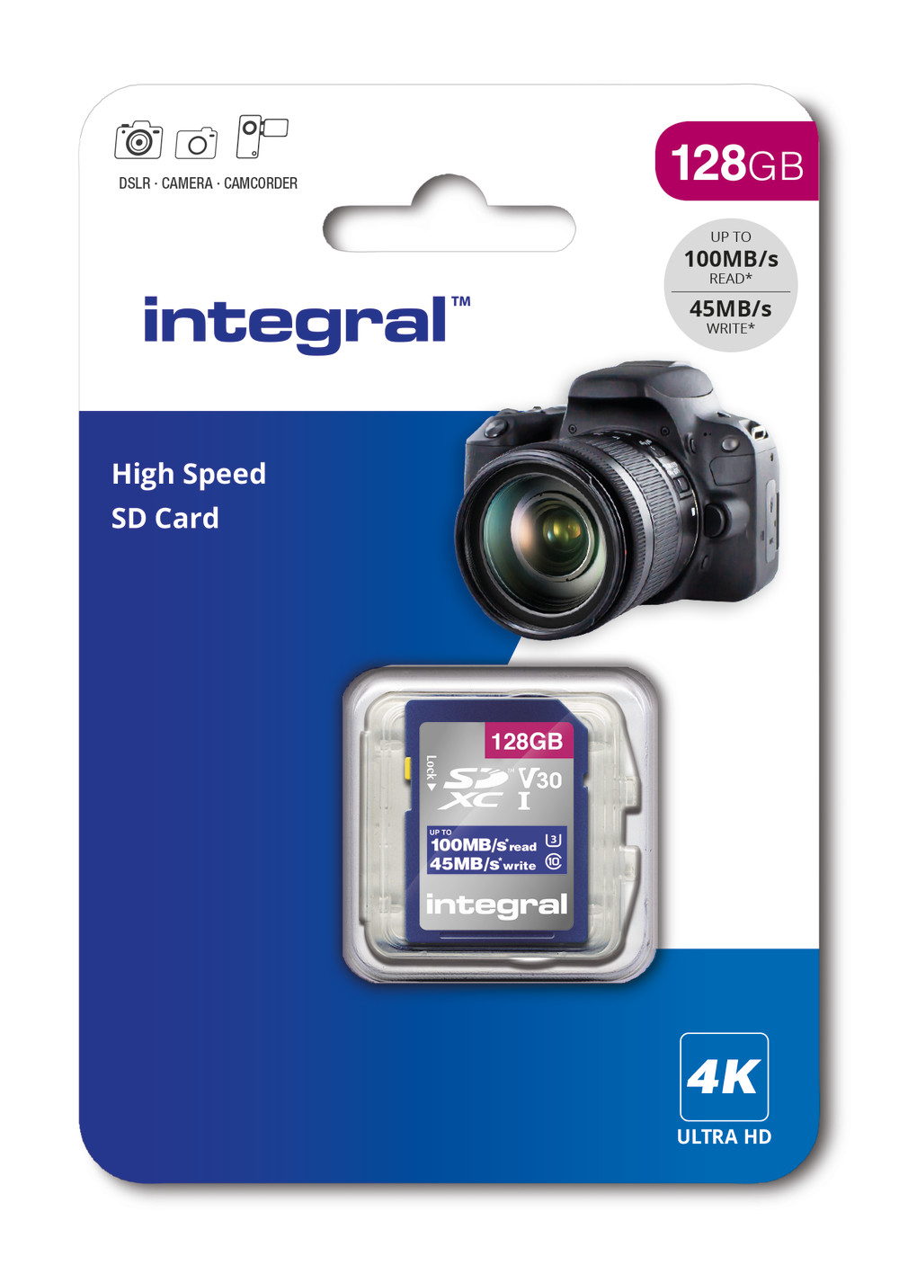 Integral INSDX128G-100V30 128GB SD CARD SDXC UHS-1 U3 CL10 V30 UP TO 100MBS READ 45MBS WRITE 128 Go UHS-I