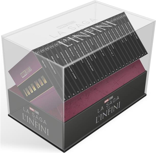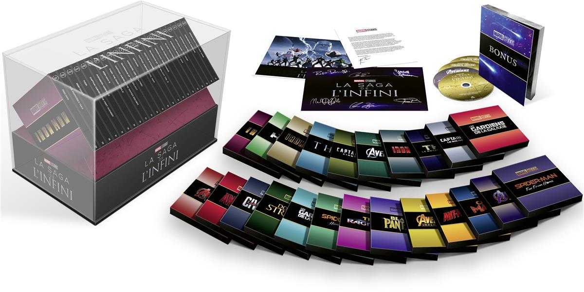Ce coffret contient 23 films et 4 Blu-Ray bonus : 4K Iron Man +2D 4K L'Incroyable Hulk +2D 4K Iron Man 2 +2D 4K Thor +2D 4K Captain America : The First Avenger +2D 4K Avengers +2D 4K Iron Man 3 +2D 4K Thor le Monde des Ténèbres +2D 4K Captain America : Le Soldat de l'Hiver +2D 4K Les Gardiens de la Galaxie +2D 4K Avengers L'ère d'Ultron +2D 4K Ant-Man +2D 4K Captain America : Civil War +2D 4K Doctor Strange +2D 4K Les Gardiens de la Galaxie vol.2 +2D 4K Spider-Man Homecoming +2D 4K Thor Ragnarok +2D 4K Black Panther +2D 4K Avengers Infinity War +2D 4K Ant-Man et la Guêpe +2D 4K Captain Marvel +2D 4K Avengers Endgame +2D 4K Spider-Man Far From Home +2D MCU Phase 3.1 Bonus disc MCU Phase 3.2 Bonus disc Avengers Endgame Bonus The Infinity Saga Bonus.