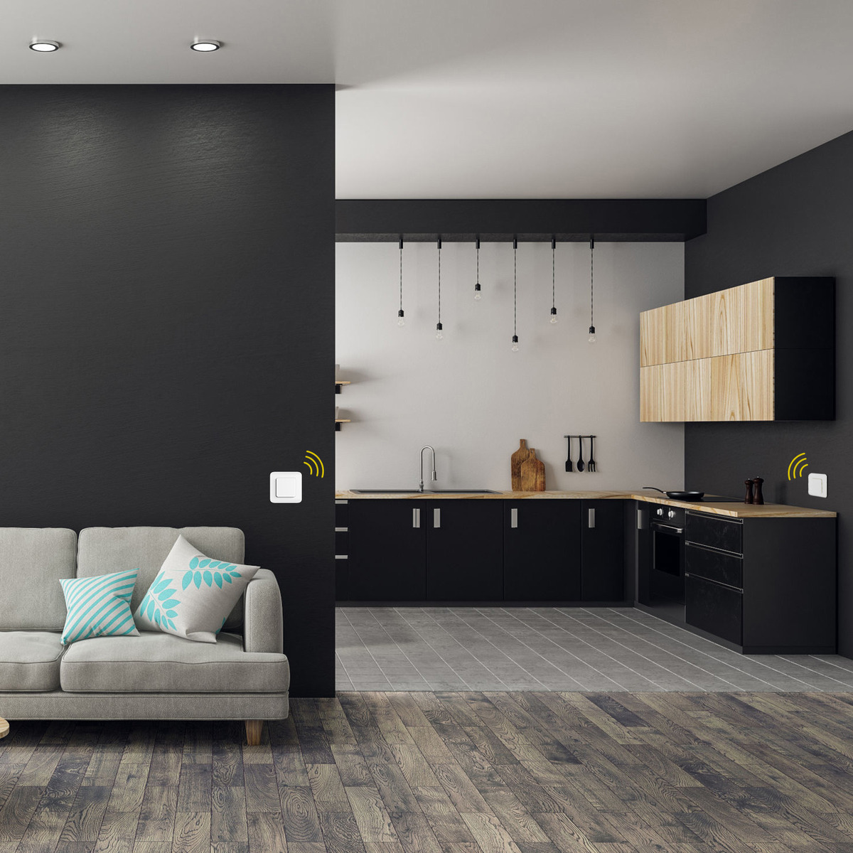 L'avantage de cette radiofréquence sans fil, c'est qu'en cas de perturbation Wi-Fi, vous aurez toujours la possibilité de switcher et de commander votre interrupteur en local sans aucune difficulté. L'avantage du contrôle en Wi-Fi, c'est que vous pouvez aussi bien commander vos lumières depuis chez vous, mais également n'importe où dans le monde grâce à notre application gratuite DiO one.