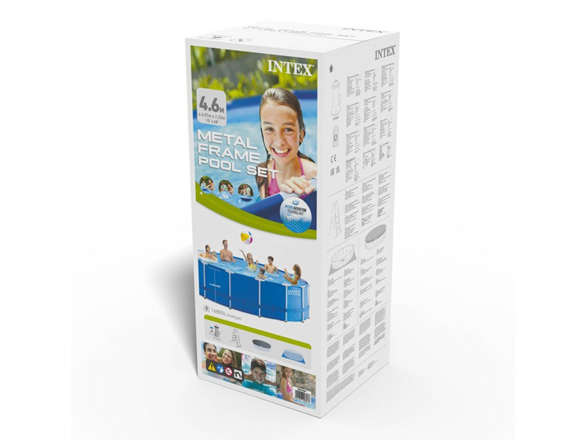 Intex 28242NP. Type de piscine: Piscine hors sol, Forme: Rond, Capacité: 16805 L. Capacité de filtration: 3785 l/h, Tension de la pompe: 220 - 240 V. Largeur: 4570 mm, Hauteur: 1220 mm, Profondeur: 4570 mm. Largeur du colis: 1292 mm, Profondeur du colis: 511 mm, Hauteur du colis: 552 mm