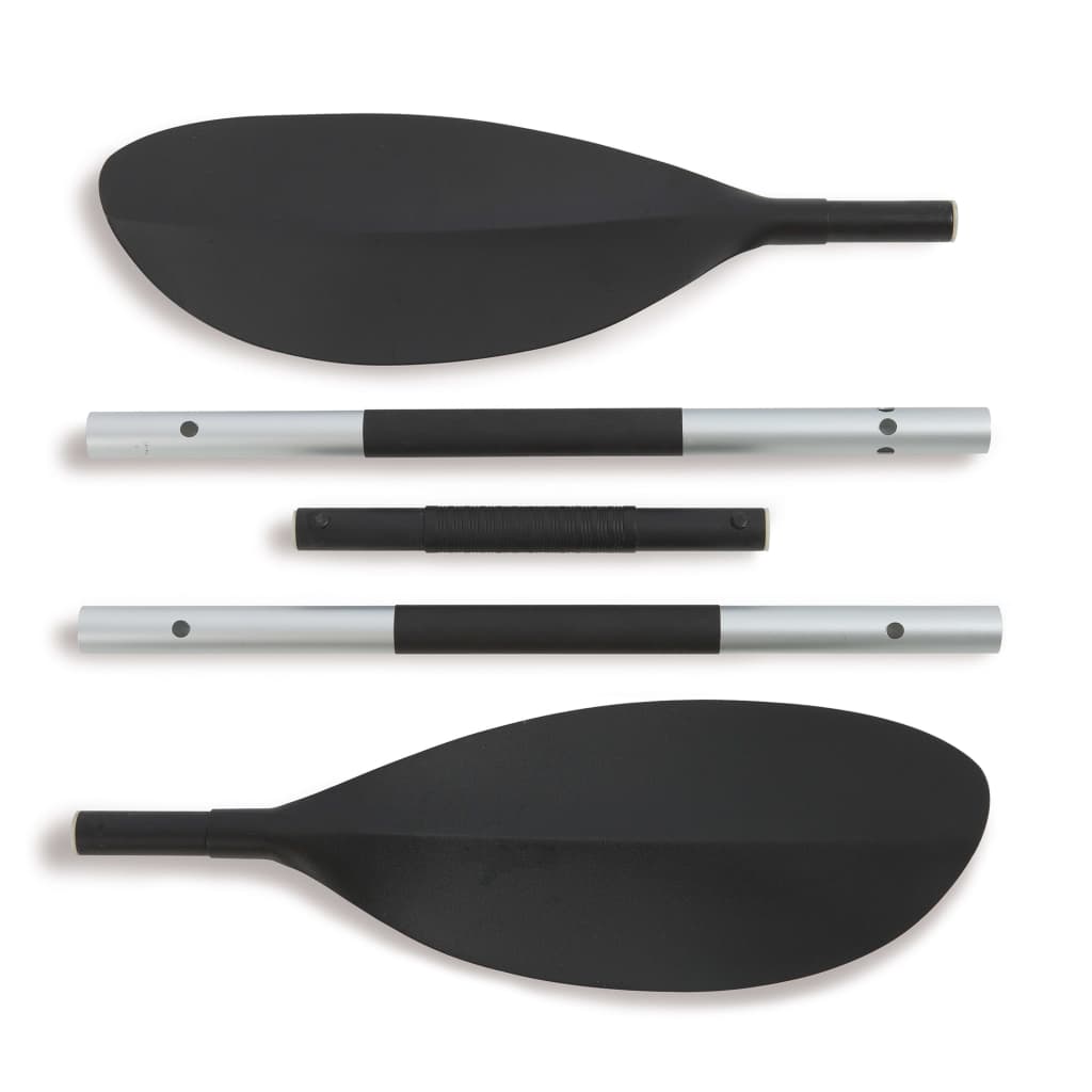 La livraison comprend un kayak gonflable, deux pagaies en aluminium, une pompe, un kit de réparation et un sac de rangement.