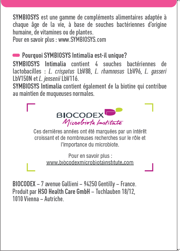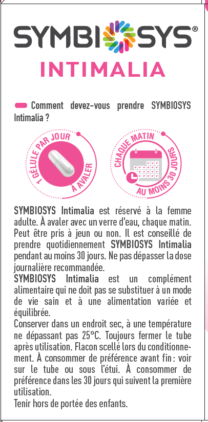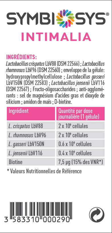 Symbiosys intimalia est un complément alimentaire destiné à la femme adulte. il contient 4 lactobacilles l. crispatus lbv88, l. rhamnosus lbv96, l. gasseri lbv150n, l. jensenii lbv116. symbiosys® intimalia contient également de la biotine qui contribue au maintien de muqueuses normales.